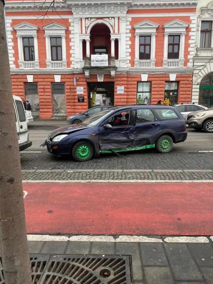 Autoturismul Ford din imagini este lovit pe partea laterală, iar cealaltă mașină este pe pietonală. Cel mai probabil a fost vorba despre neacordarea de prioritate la schimbarea benzii de circulație (Foto: Zetes Catalin / Info Trafic. jud. Cluj).