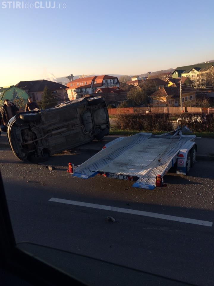 ”Un conducător auto care se afla la volanul unui autoturism de teren, în timp ce se deplasa în direcția Aeroportului, a pătruns de pe banda întâi pe banda a doua fără a se asigura corespunzător, intrând în coliziune cu un șofer care tracta un alt automobil pe platformă, proiectându-l într-un alt participant la trafic”, a declarat purtătorul de cuvânt al IPJ Cluj.