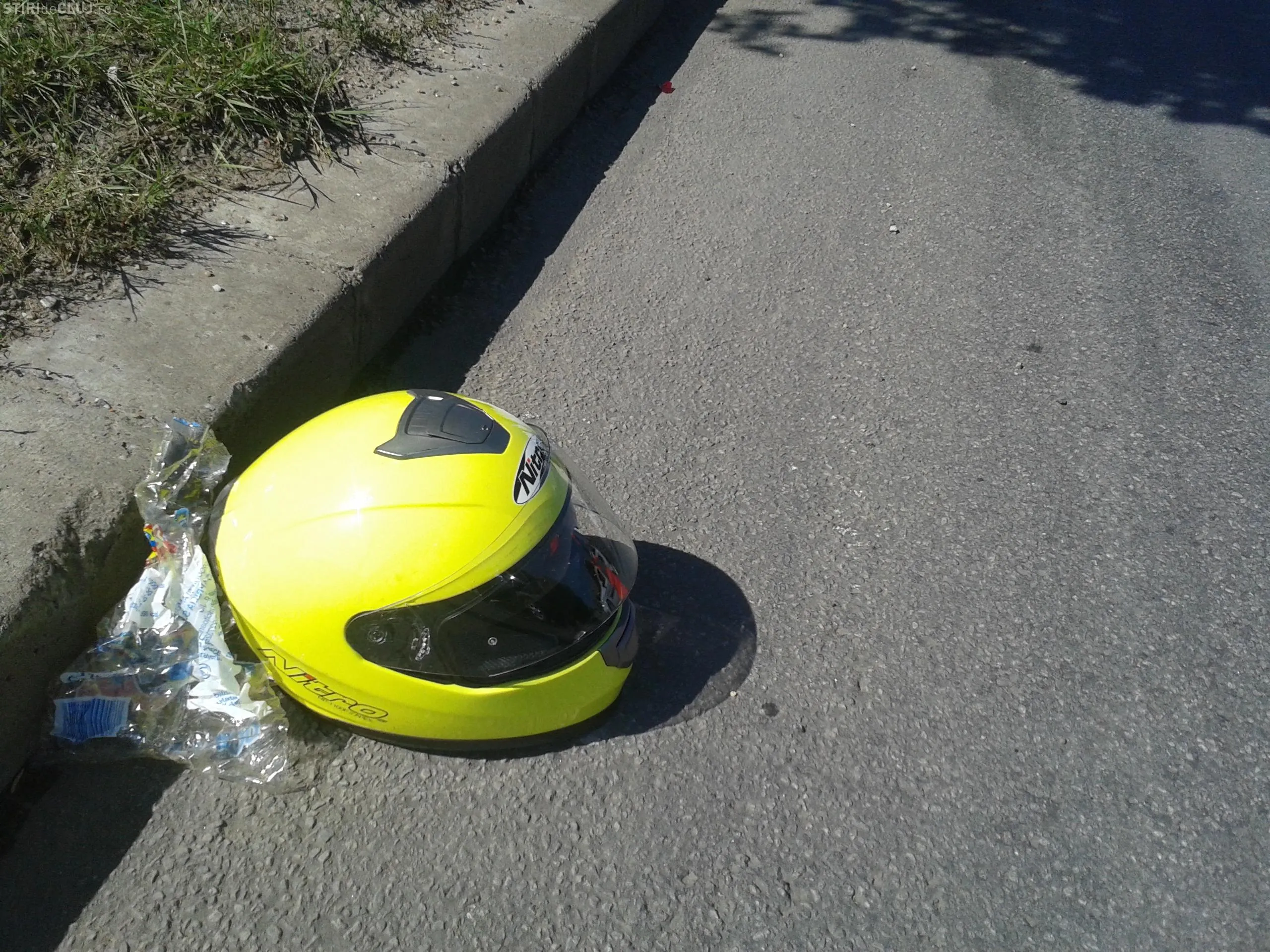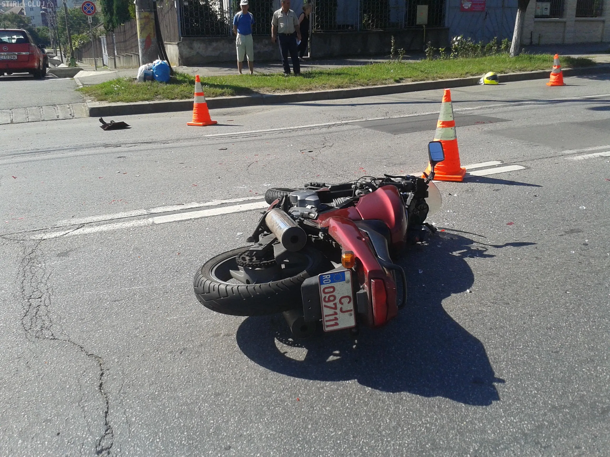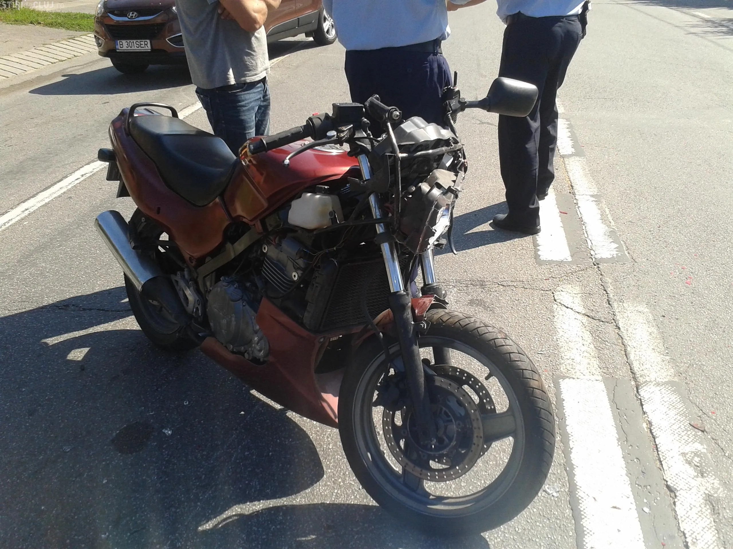 În urma coliziunii, motocicleta s-a răsturnat pe partea carosabilă.
