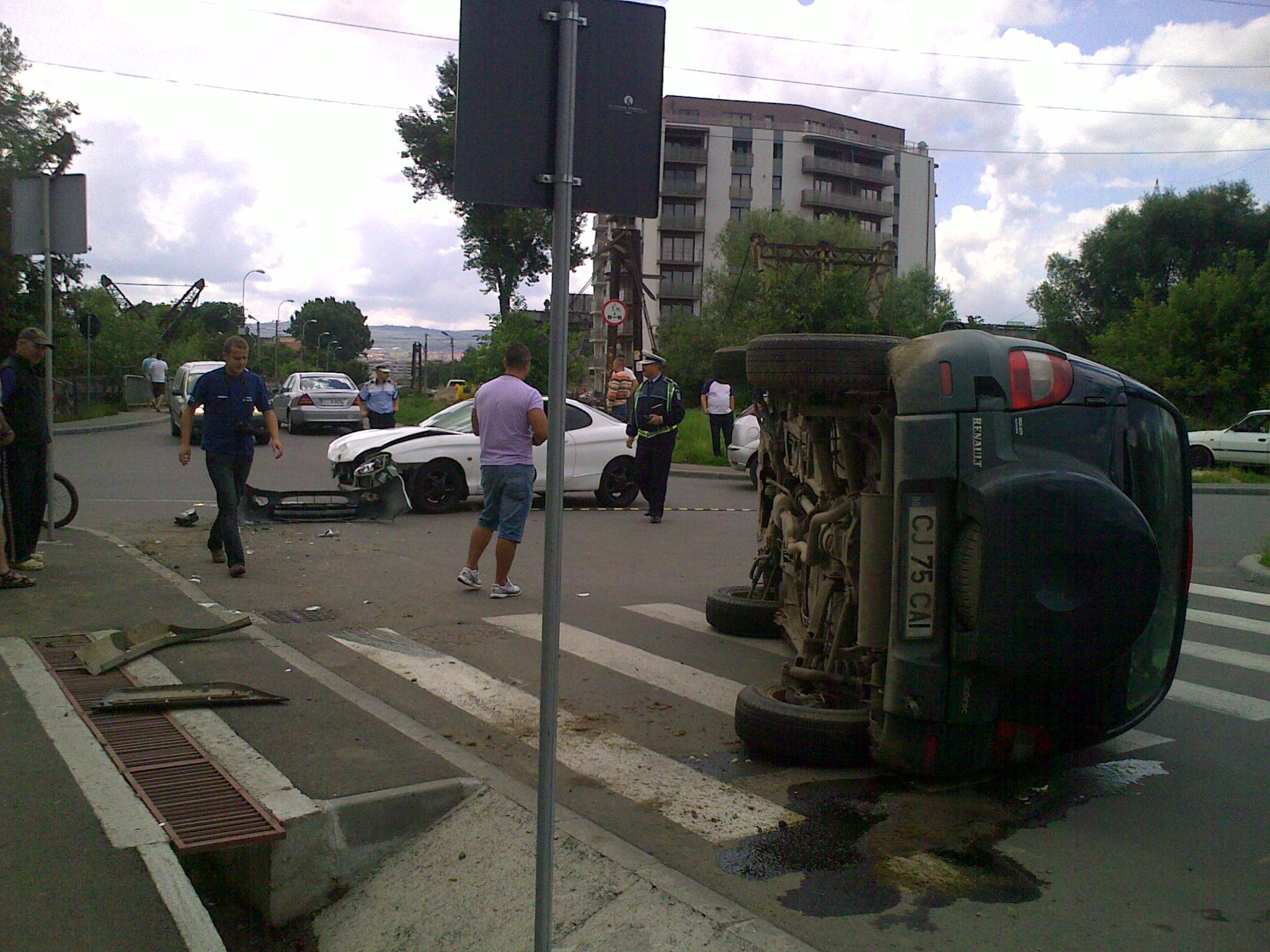 Un accident grav s-a produs in jurul orei 12.30 pe strada Nadasel din Cluj-Napoca. Un autoturism de teren marca Renault s-a ciocnit cu un Hyundai si s-a rasturnat.