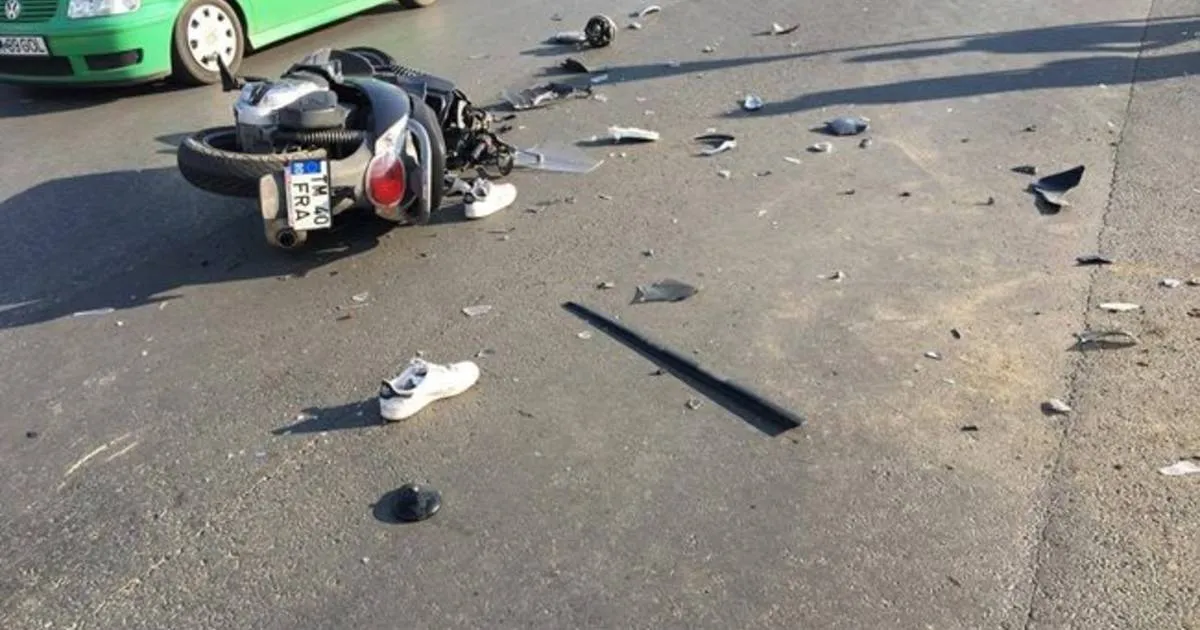 Accident pe strada Oașului. Un scuterist a derapat pe linia de tramvai și a intrat într-o mașină