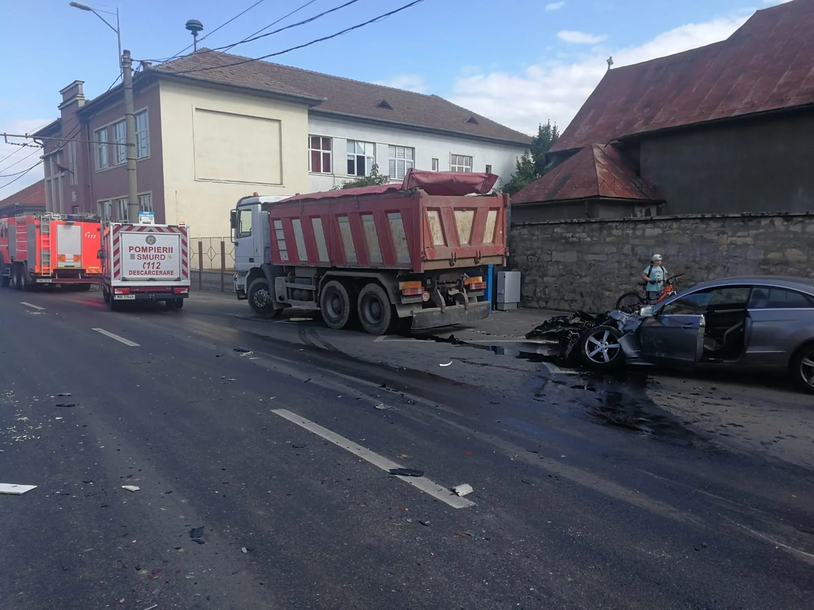 ISU Cluj a fost alertat prin 112 pentru a interveni la un accident rutier, dintre un autoturism și o autobasculnată. ”O victima ieșită din autoturism avea atac de panică. Intervenim cu două 2 autospeciale cu modul de descarcerare. În acest moment victimei i se acorda îngrijiri medicale de către un echipaj SAJ”, precizează ISU Cluj.