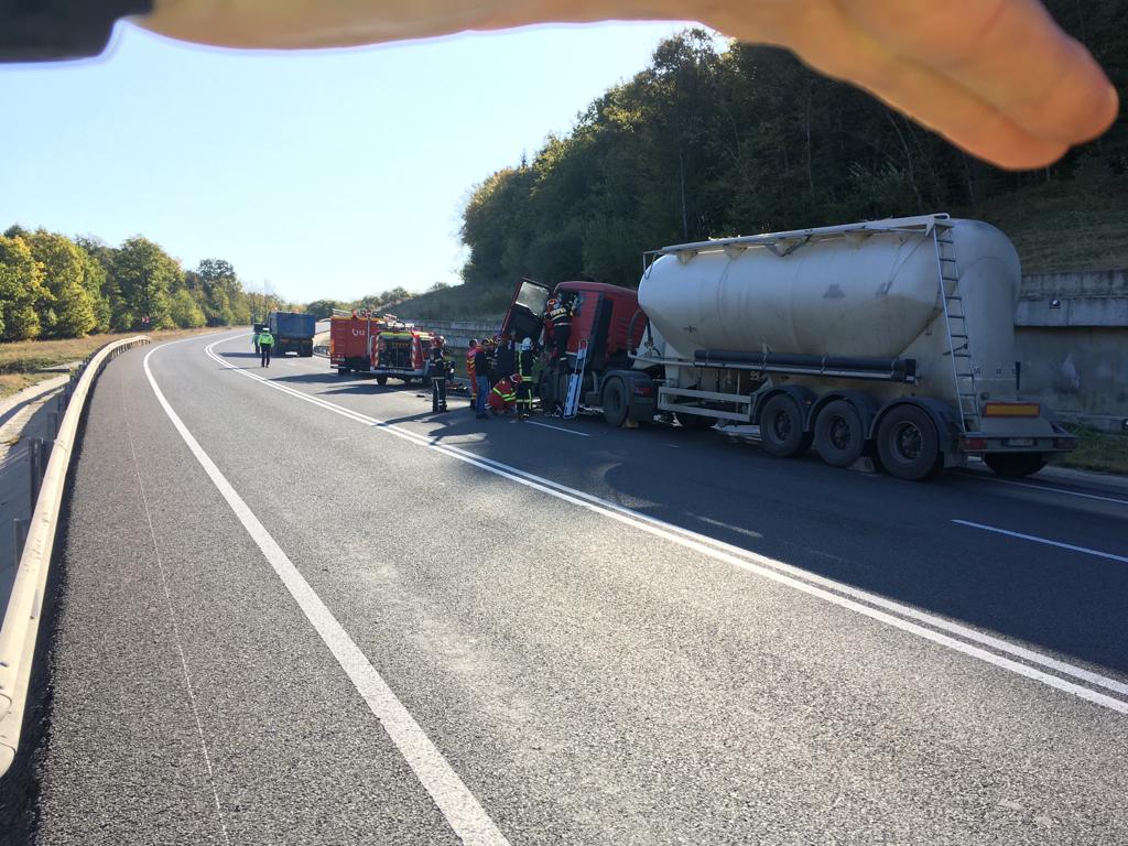 Din primele informații, în accident au fost implicate două autocamioane. În urma impactului, o persoană a rămas încarcerată.