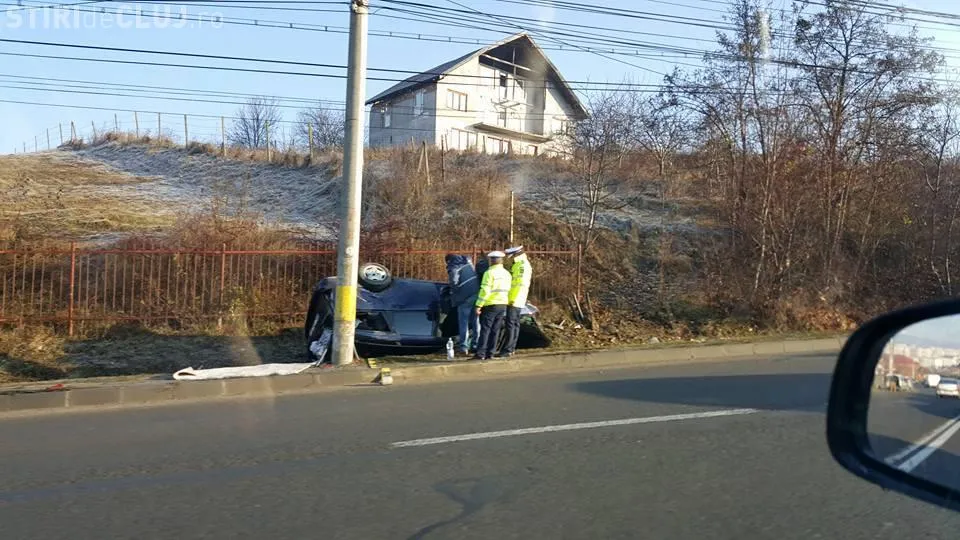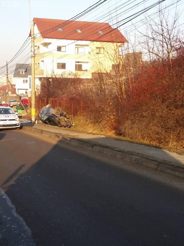 Accident pe varianta Zorilor-Mănăștur! O șoferiță s-a răsturnat cu mașina în șanț FOTO