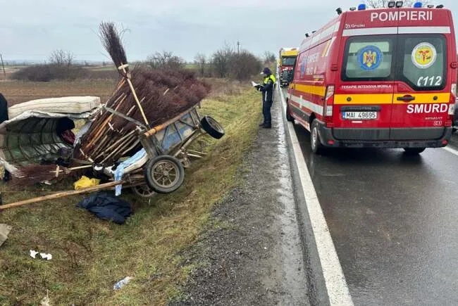 Potrivit primelor informații, tânărul nu ar fi păstrat distanța legală, acroșând căruța condusă de un bărbat de 59 de ani care circula în fața sa. Impactul a fost extrem de violent, căruța fiind aruncată pur și simplu într-un șant.