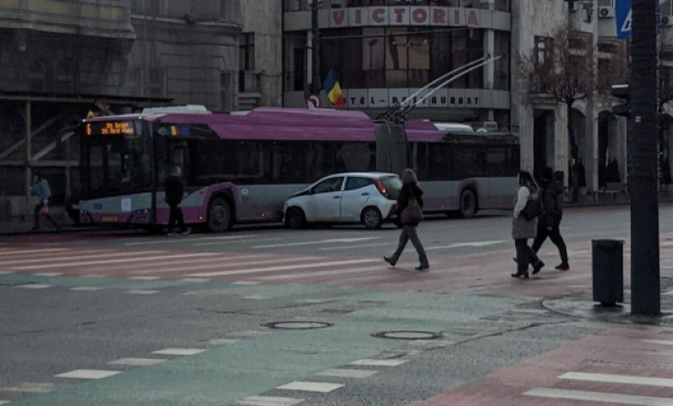 Accident rutier în centrul Clujului. O mașină a intrat într-un troleibuz CTP