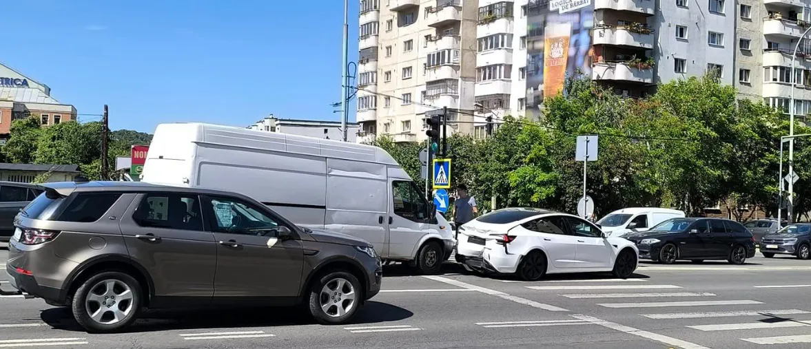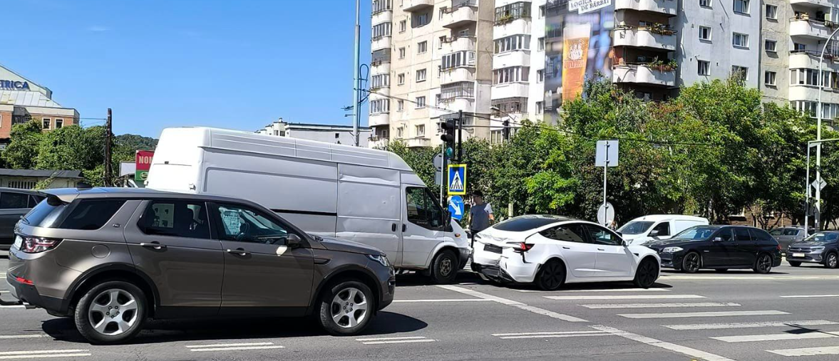 Accident rutier în zona podului Calvaria. O dubiță a lovit o mașină Tesla
