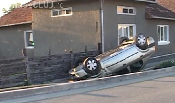 Accident rutier Ocna Dej! O șoferiță a dat în bordură și s-a răsturnat cu mașina VIDEO