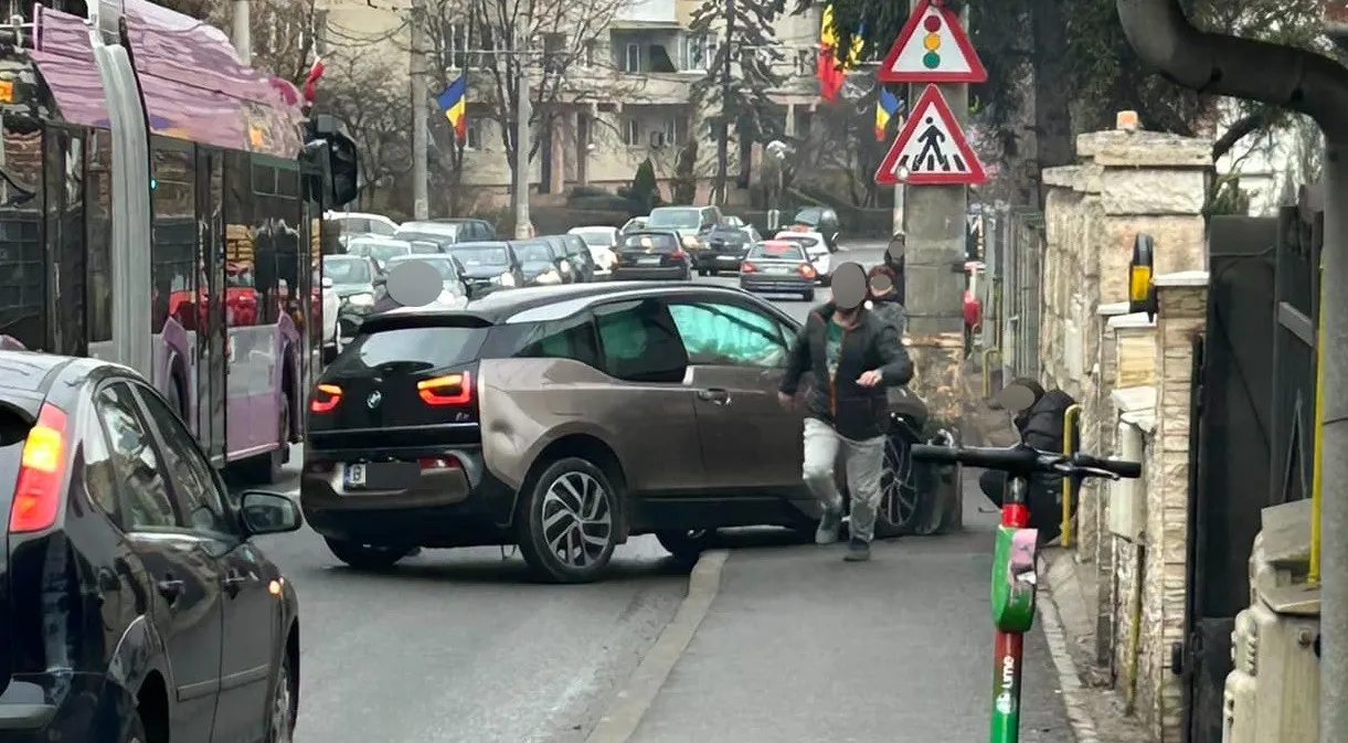 Potrivit martorilor, un BMW electric, model I3, a ajuns într-un stâlp aflat pe trotuar, autoturismul rămânând pe partea carosabilă. Din acest motiv, traficul este aglomerat.