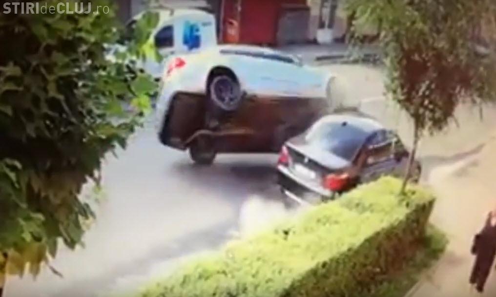 Accident spectaculos în jud. Cluj! Mercedes răsturnat după ce a lovit o mașina parcată