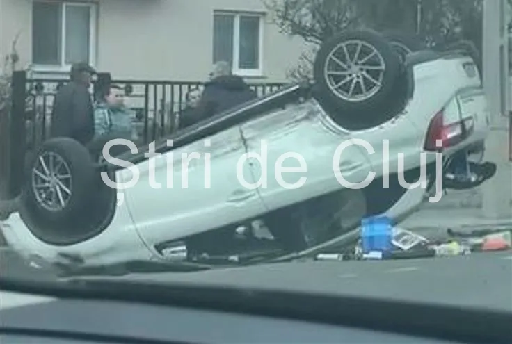 Accident spectaculos la Cluj: Mașină răsturnată, cu roțile în sus, după o coliziune VIDEO
