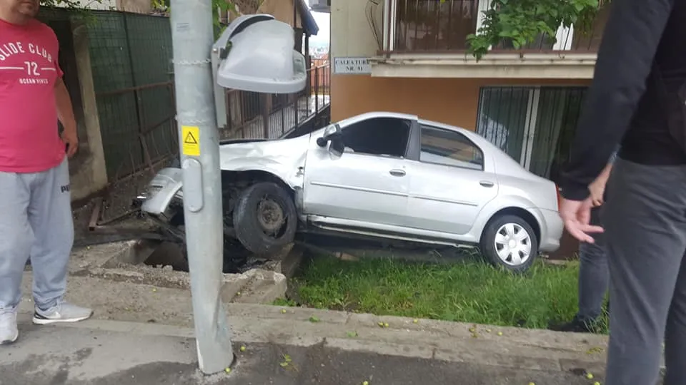 Șoferul a pierdut controlul asupra volanului pe coborâre, a ajuns pe trotuar, unde a rupt spâlpii și s-a oprit la mai puțin de un metru de geamul de la parter al unui apartament.