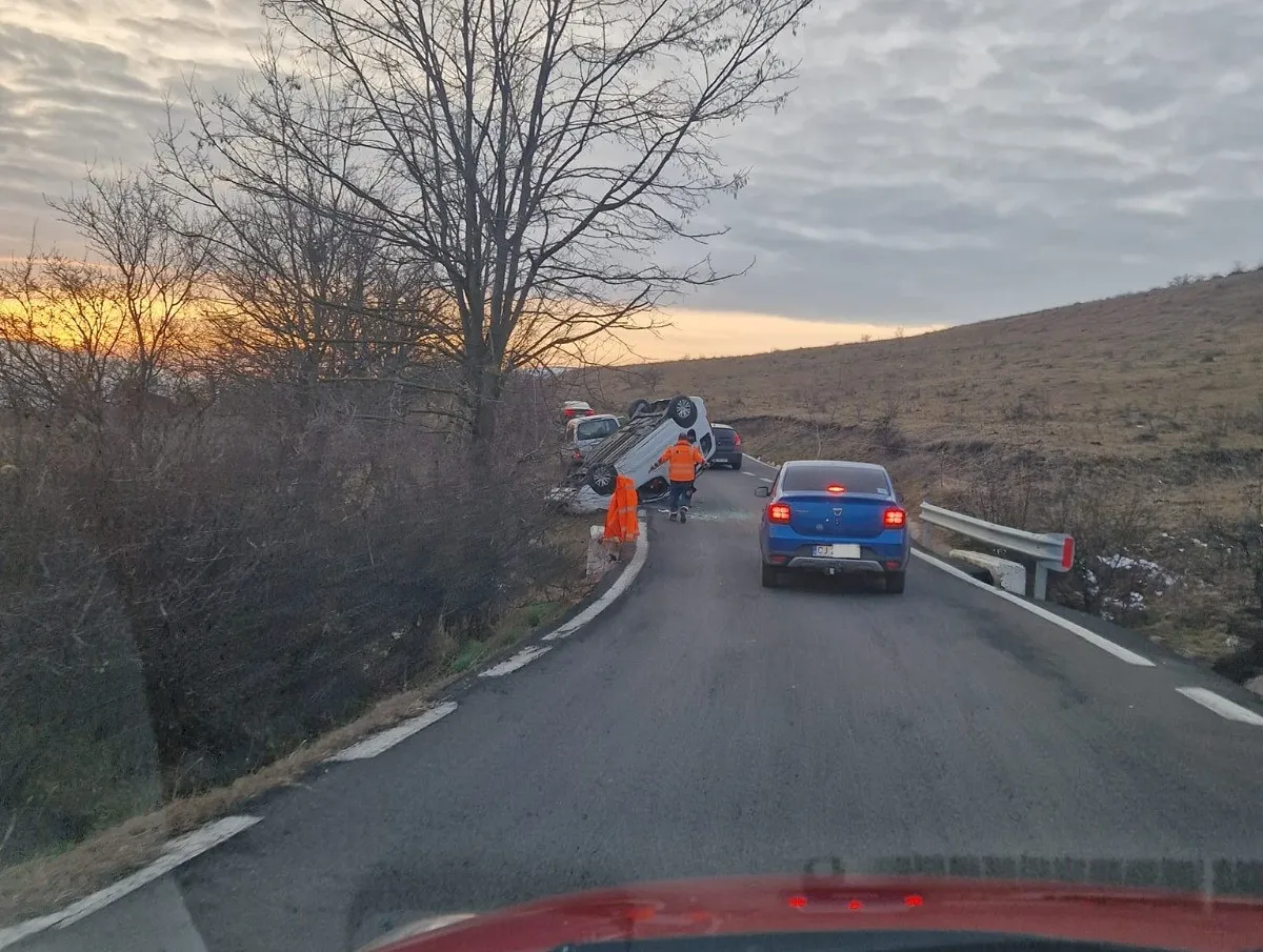 Potrivit martorilor, în evenimentul rutier a fost implicată o singură mașină care s-a răsturnat pe partea carosabilă.