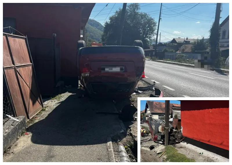 Accident teribil în Cluj: Un șofer a făcut praf mașina, s-a răsturnat în Poieni - FOTO