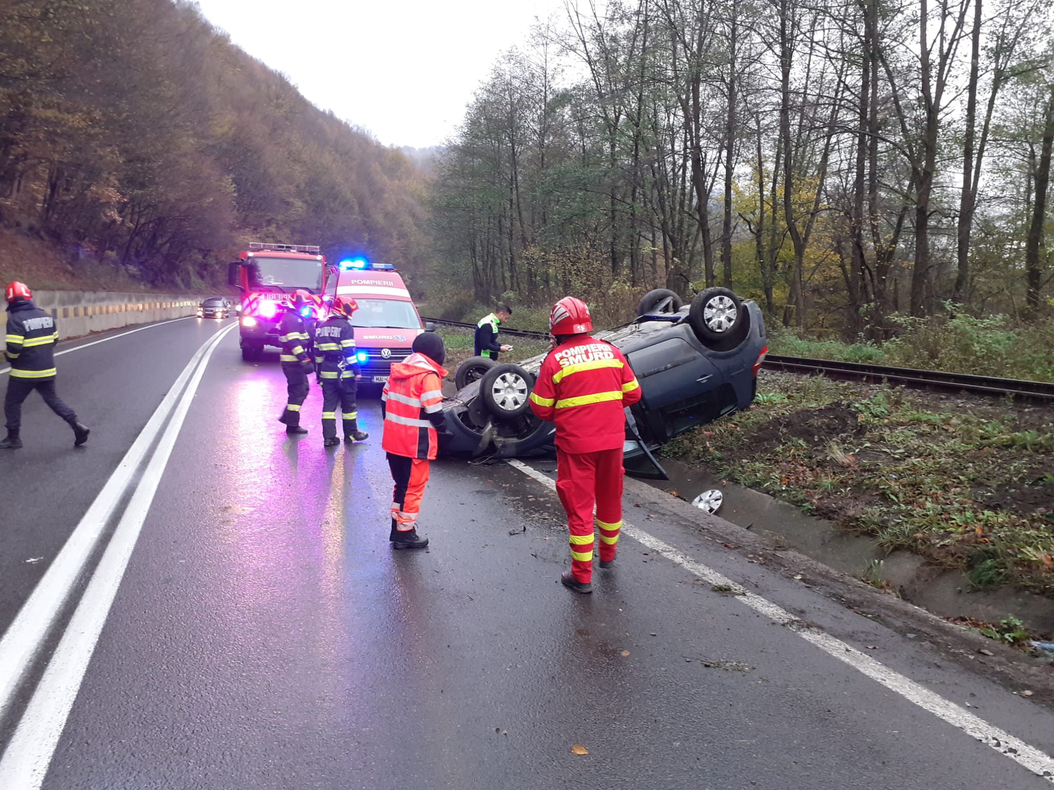 „Echipajele operative au găsit la fața locului un autoturism răsturnat pe plafon, însă din fericire nu există victime încarcerate.