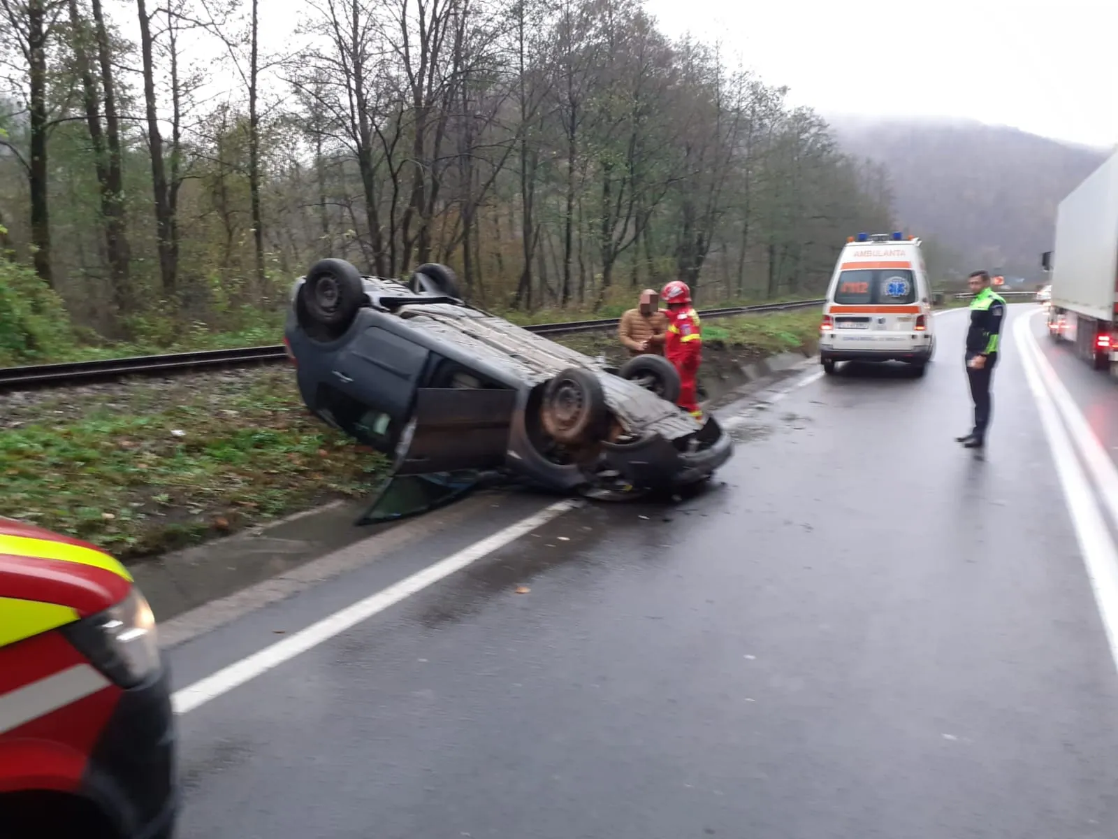 Accidente în lanț în Cluj! ISU intervine pe DN1 E60, în localitatea Negreni o mașină s-a răsturnat - FOTO