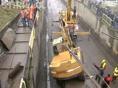 Accidentul de la pasaj s-a produs miercuri, la ora 12.00. Soferul unui trailer care transporta un excavator nu a respectat indicatoarele rutiere, care ii interziceau sa treaca prin acea zona si a lovit pasajul cu bratul cupei utilajului.