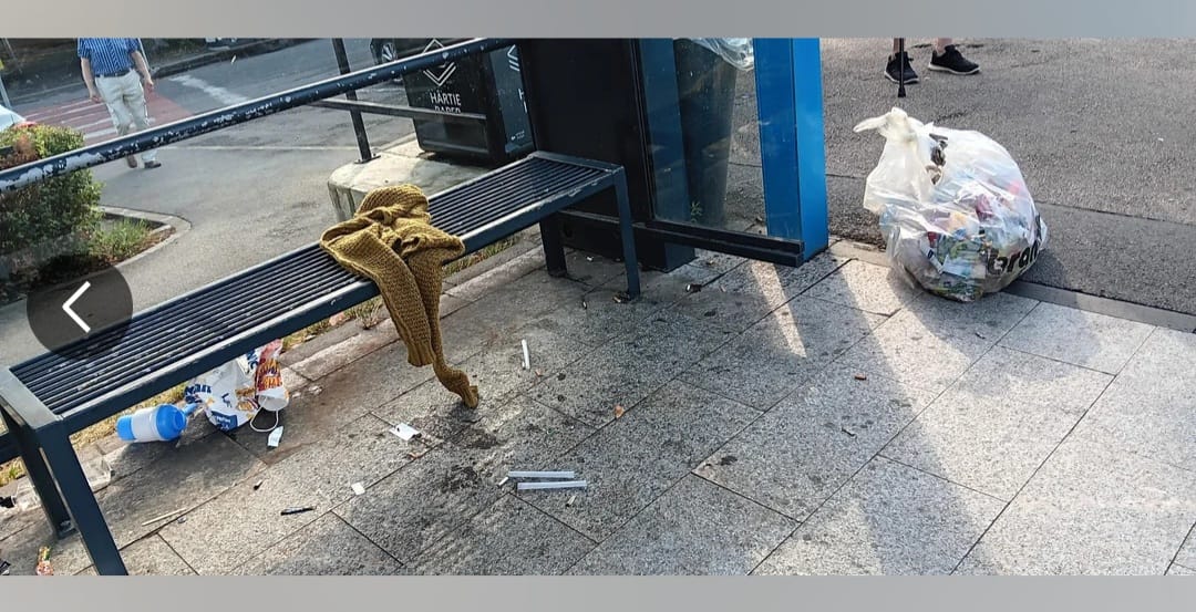 E dezastru în cartierul Gheorgheni din Cluj-Napoca. Stațiile de autobuz arată ca în ghetou, mizerie multă și oamenii străzii care își fac veacul pe scaunele din stație.