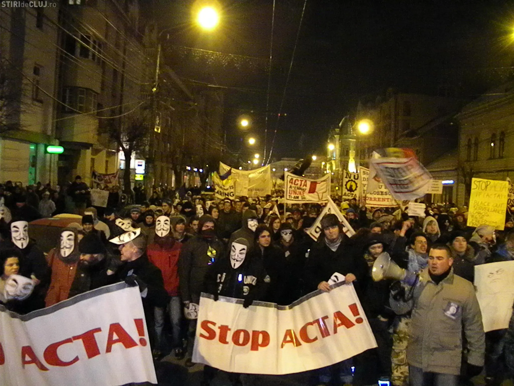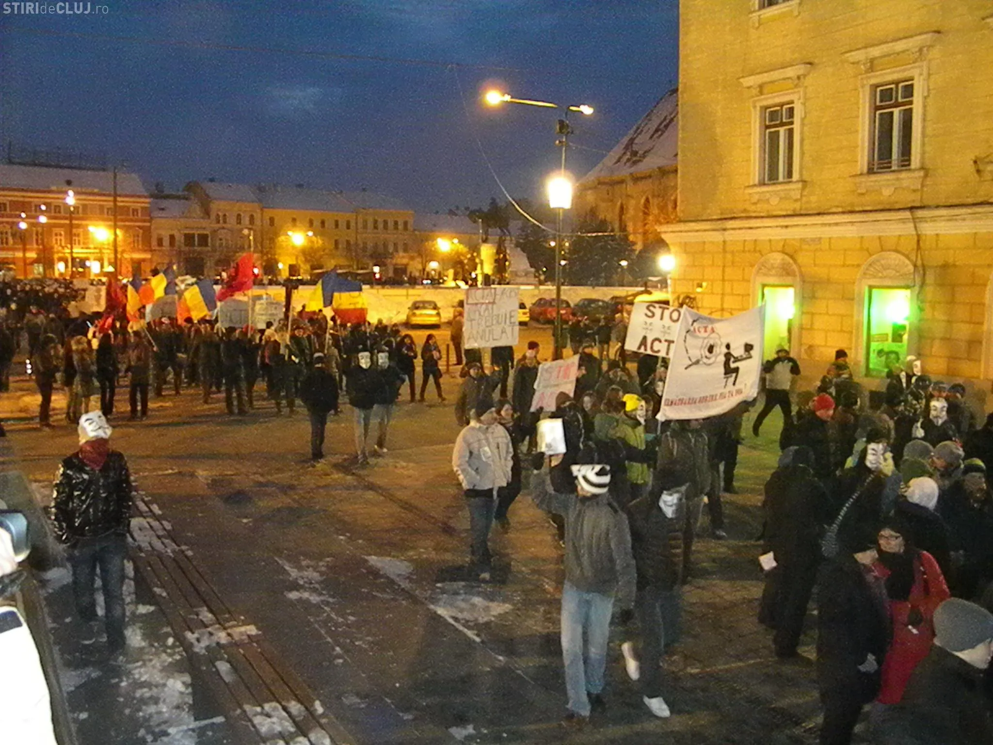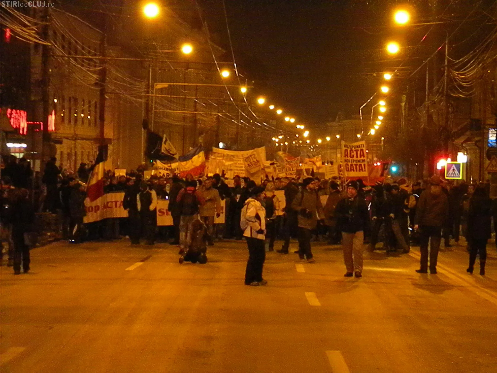 Protestatarii anti ACTA, stransi in Piata Unirii la ora 17.00, au pornit intr-un mars prin centrul Clujului. Manifestatia s-a unit cu cea a protestatarilor obisnuiti deja din Piata Unirii, care cer demisia lui Traian Basescu de cateva saptamani.