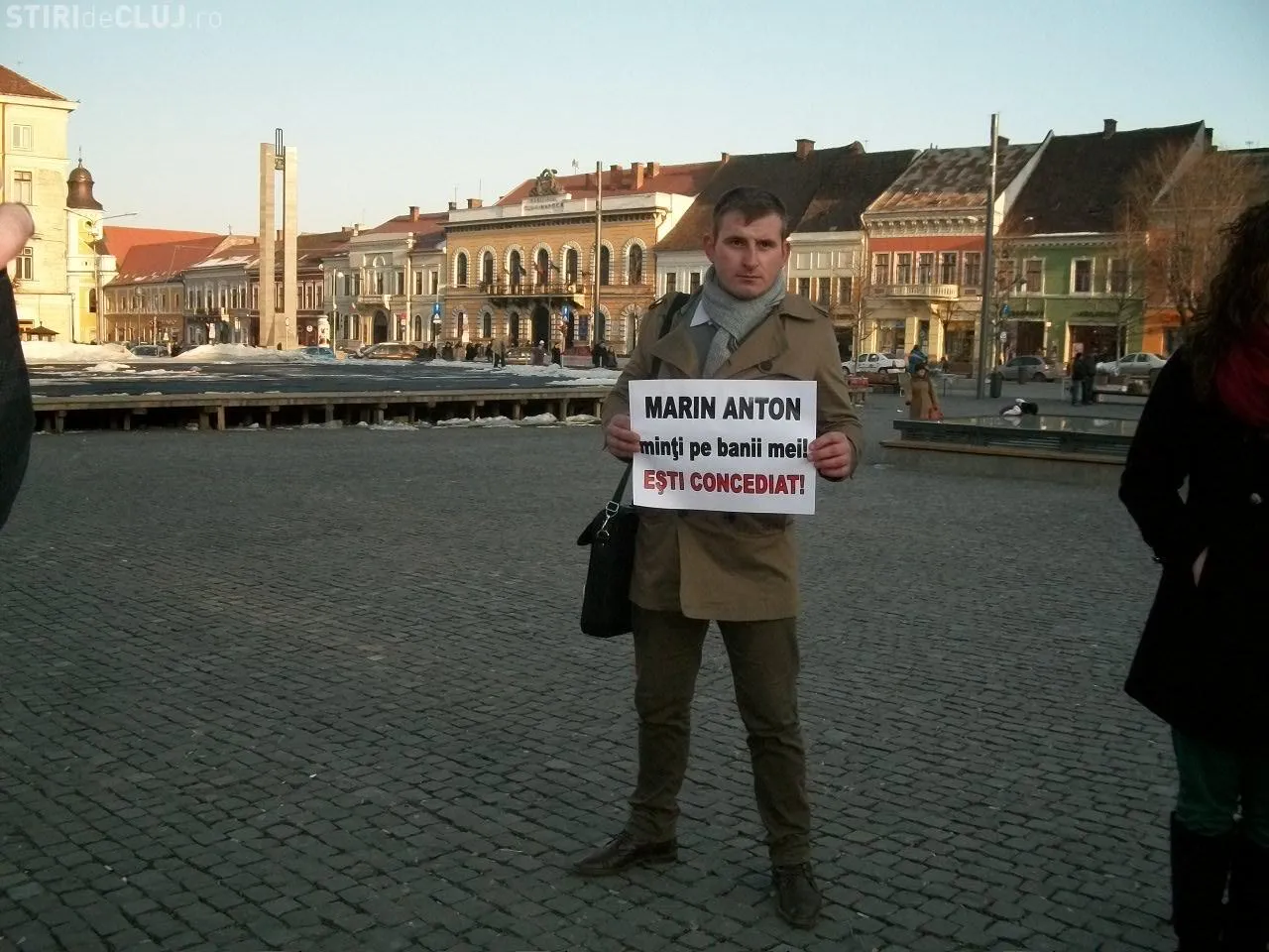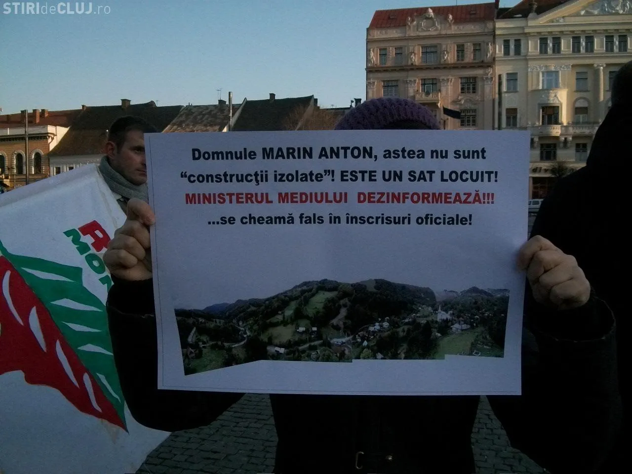 Cei prezenti in Piata Unirii au adus cu ei pancarte cu mesajul "Domnule Marin Anton, nu iti cer demisia, iti dau preaviz! Elibereaza postul", "Marin Anton, minti pe banii mei!", "Domnule Marin Anton, astea nu sunt 'constructii izolate'! Este un sat locuit. Ministerul Mediului Dezinformeaza! ...Se cheama fals in inscrisuri oficiale".