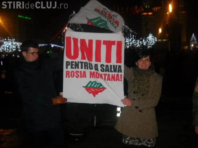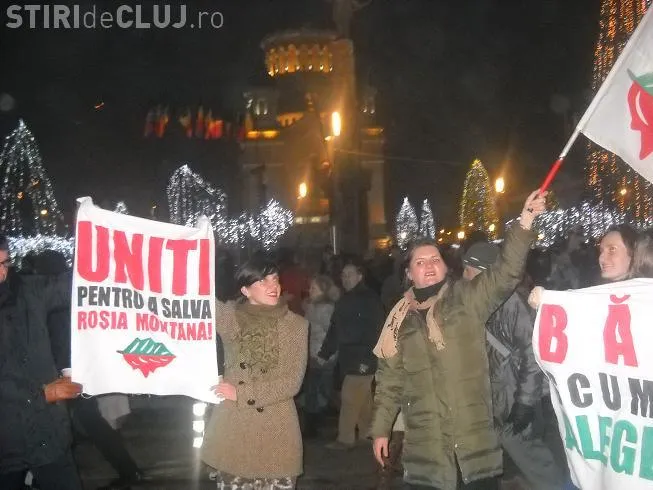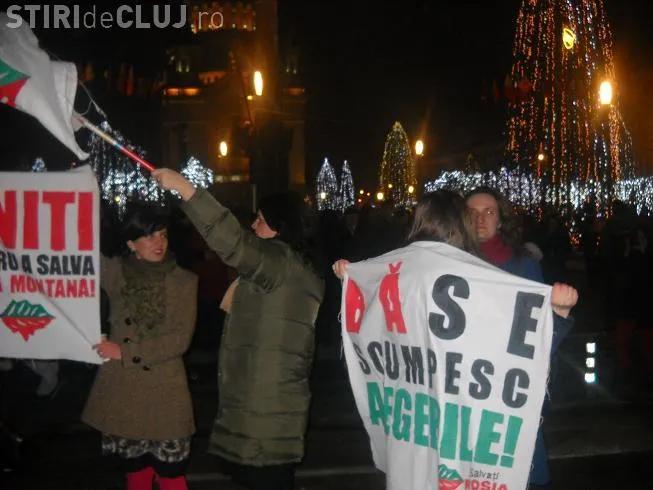 Activistii ecologici au prostestat impotriva proiectului minier de la Rosia Monana in timpul artificiilor din noaptea de Anul Nou din Piata Avram Iancu.