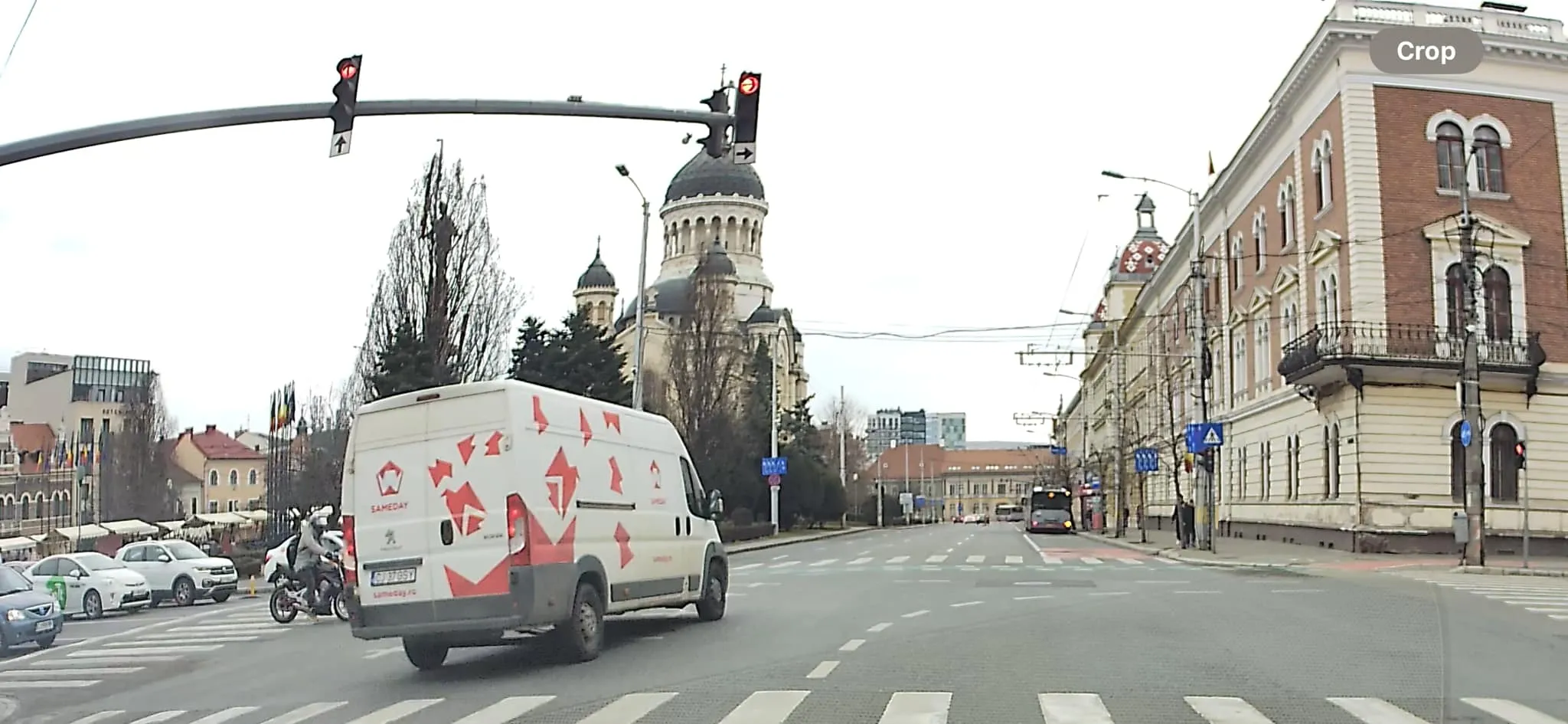Din fericire, cel de pe scuter a frânat, observând că șoferul dubei a intrat pe roșu. Dacă era cu o jumătate de metru mai în față, vorbeam despre un accident foarte grav.