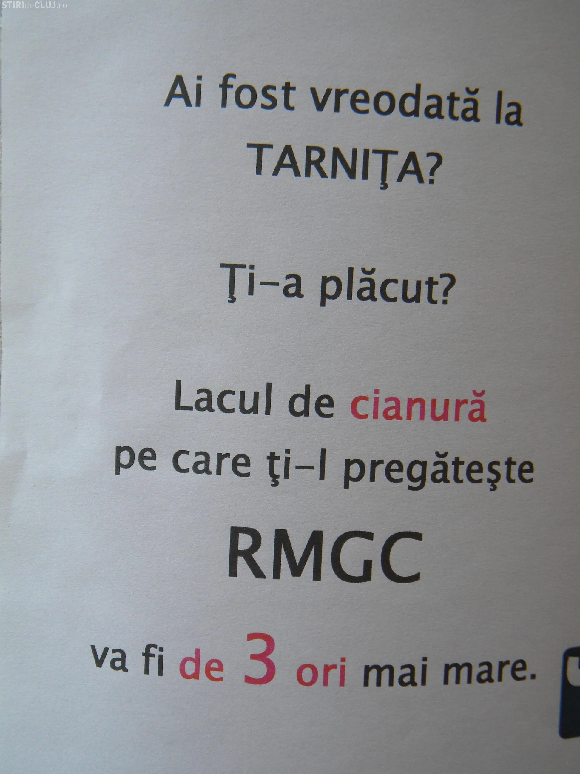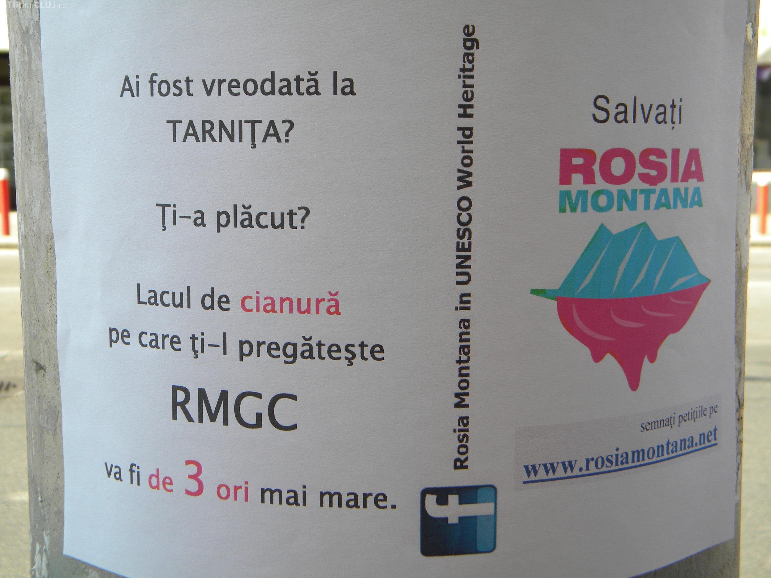 "Ai fost vreodata la Tarnita? Ti-a placut? Lacul de cianura pe care ti-l pregateste RMGC va fi de 3 ori mai mare", scrie pe afisele lipite pe stalpii din centrului municipiului Cluj-Napoca.