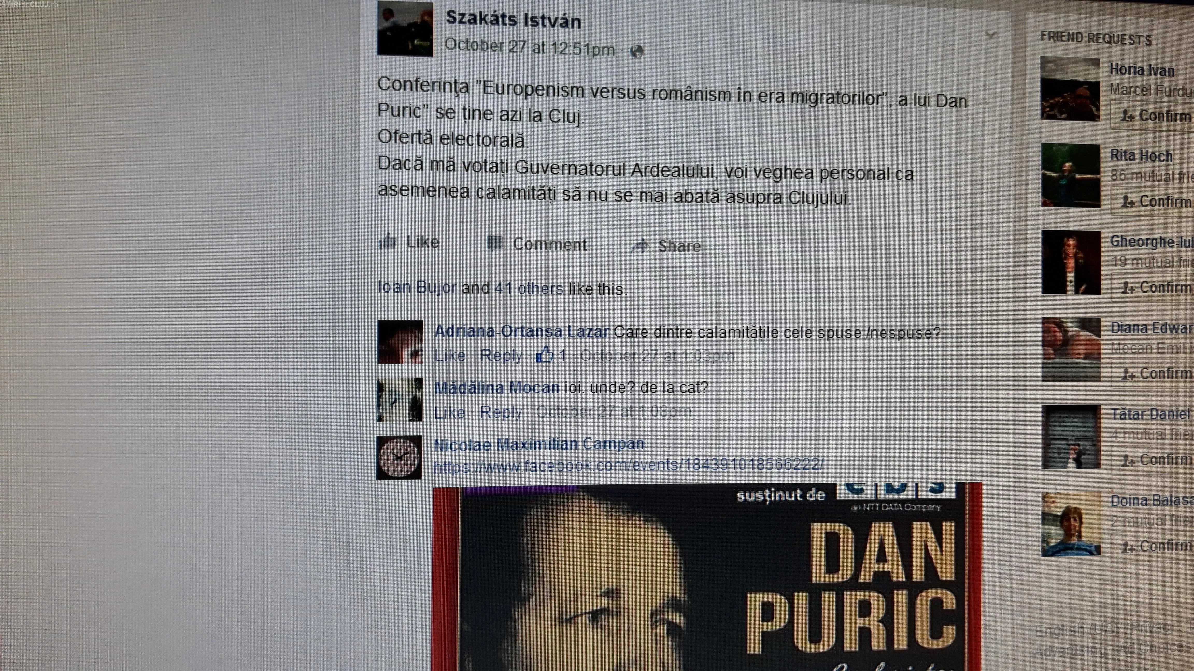 ”Nu văd de ce asta e material de știre. Mai degrabă e de cancan. Mie nu-mi place de Puric, și o să zic asta și în fața lui Sfântu Petru. Pe de altă parte îmi place de Ion, și îmi pare rău să-l văd supărat. I-am și scris asta. Succes la eveniment”, a afirmat Szakats Istvan.