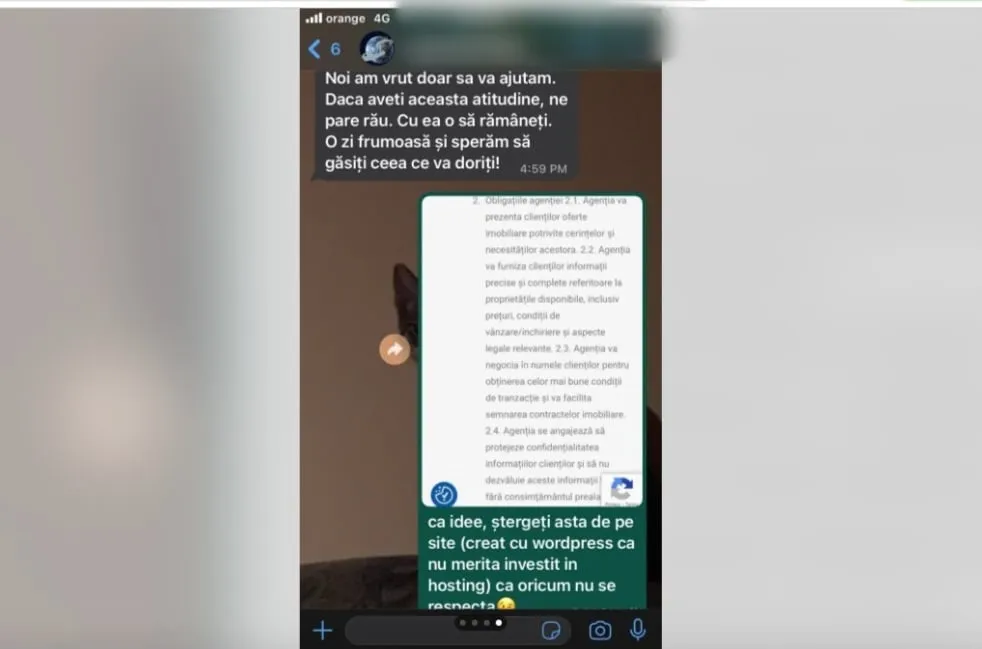 În „jungla imobiliară” din Cluj supraviețuiește cine poate, iar agenții imobiliari nu încetează să-i uimească pe potențialii clienți cu serviciile „de calitate” oferite. De data aceasta dialogul cu un client a stârnit valuri de reacții pe o rețea de socializare. Totul ar fi pornit de la faptul că un agent imobiliar, care ar trebui teoretic să organizeze vizionări pentru clienții săi, i-a transmis potențialul chiriaș să completeze contractul de colaborare fără să se obosească măcar să-i organizeze acestuia o vizionare. Agentul voia să-l pună pe chiriaș în legătură directă cu proprietara imobilului, iar ulterior să încaseze comisionul fără să depună un minim efort de a-i oferi chiriașului consiliere și asistență, lucruri de care ar trebui de altfel să se ocupe o agenție imobiliară.
