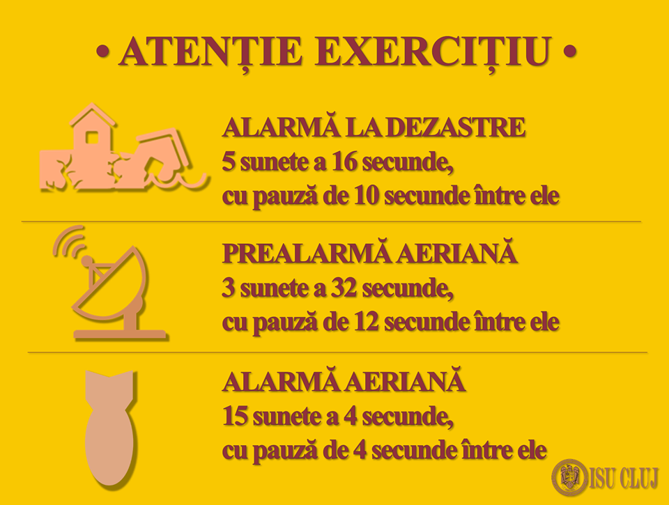 Miercuri, 3 aprilie, începând cu ora 10.00, va avea loc un nou exercițiu “Miercurea Alarmelor” la Cluj-Napoca și în restul țării.