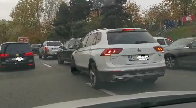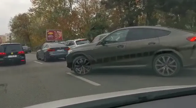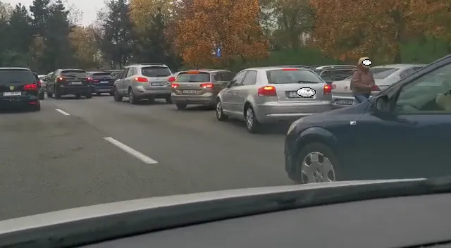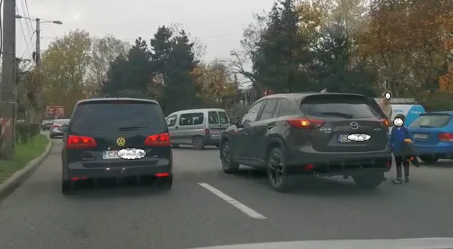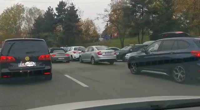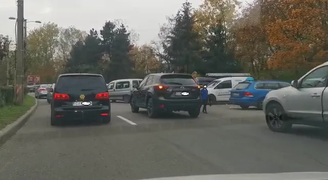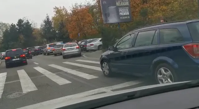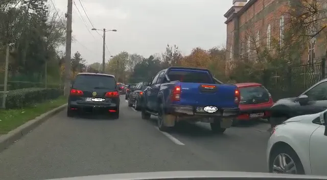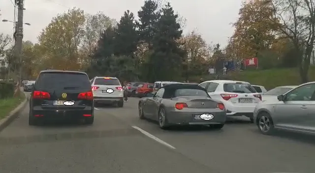 Șoferii care tranzitează zona stau în trafic și așteaptă deblocarea situației. Drumul este și asa foarte solicitat, dar parcările din dreptul școilii private de acolo fac lucrurile și mai dificile.