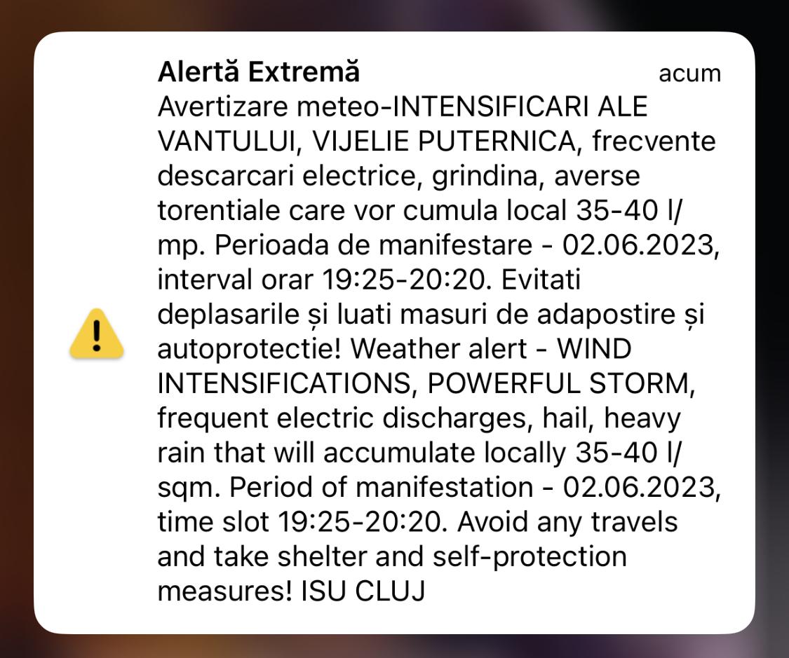 O avertizare de tip Ro-Alert a fost emisă in Cluj. Vremea extrema va fi intre orele 19.25 si 20.20.