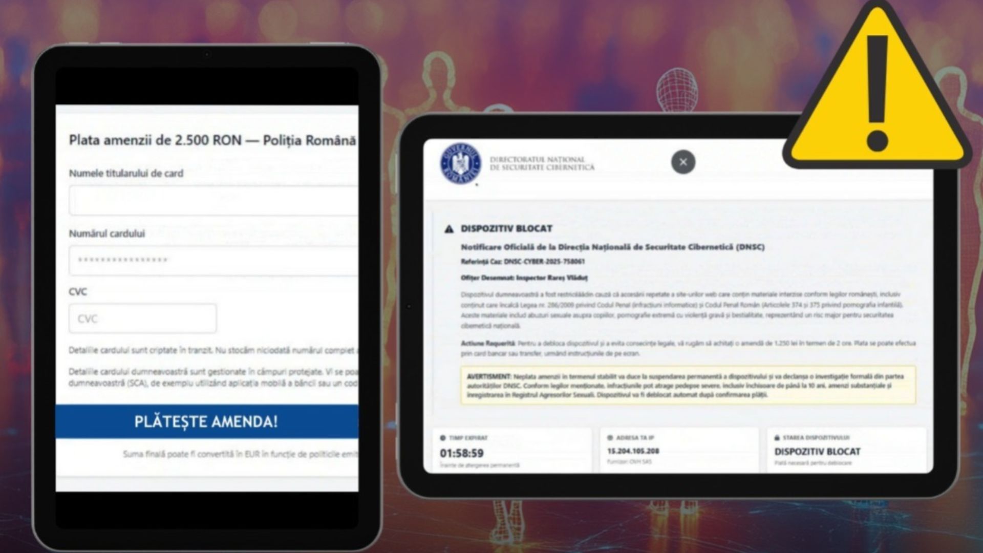 Potrivit specialiștilor în securitate cibernetică, atacatorii creează mesaje alarmante sau ferestre pop-up care apar brusc pe ecranul utilizatorilor. Victima este informată, în mod fals, că dispozitivul său ar fi fost blocat din cauza accesării unor site-uri cu conținut ilegal. În mesaj se menționează că a fost emisă o notificare oficială din partea DNSC sau a Poliției Române și este atribuit un „număr de caz” care, în realitate, nu există.
