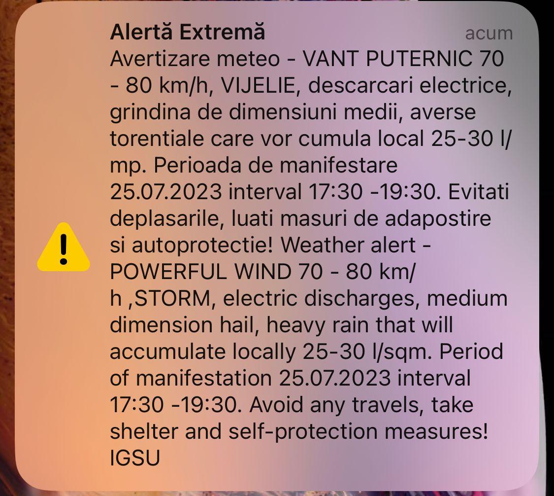 ISU Cluj a trimis un mesaj RO-Alert care anunță vijelii foarte puternice în Cluj-Napoca. Vorbim despre vijelii în care vântul va atinge 70 - 80 de km/h.