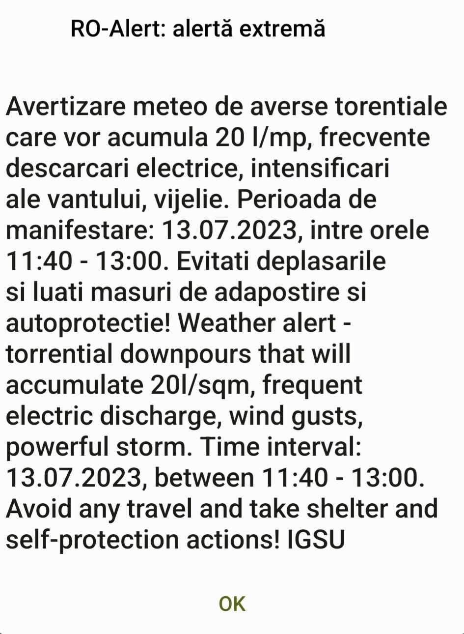 S-a emis de catre IGSU mesaj RO-ALERT, avertizare de vreme rea, pentru UAT-urile: Cluj-Napoca, Turda, Câmpia Turzii, Gherla, Huedin, Aghireșu, Baciu, Apahida, Gilău, Florești, Viișoara, Mihai Viteazu, Tritenii de Jos, Iara, Săvădisla, Cășeiu, Frata, Cojocna, Ceanu Mare, Bonțida, Iclod, Luna, Feleacu, Jucu, Moldovenești, Mica, Căpușu Mare, Mociu, Mintiu Gherlii, Dej, Unguraș, Sic, Chinteni, Chiuiești, Cuzdrioara, Gârbău, Călărași, Cămărașu, Căianu, Sânpaul, Fizeșu Gherlii, Băișoara, Câțcău, Cătina, Țaga, Vad, Mănăstireni, Suatu, Petreștii de Jos, Borșa, Sânmărtin, Sâncraiu, Bobâlna, Panticeu, Cornești, Așchileu, Dăbâca, Geaca, Vultureni, Recea-Cristur, Izvoru Crișului, Săndulești, Ciurila, Tureni, Aluniș, Pălatca, Aiton, Buza, Jichișu de Jos, Ploscoș, Gilău, Iara, Săvădisla, Băișoara, Petreștii de Jos, Valea Ierii;