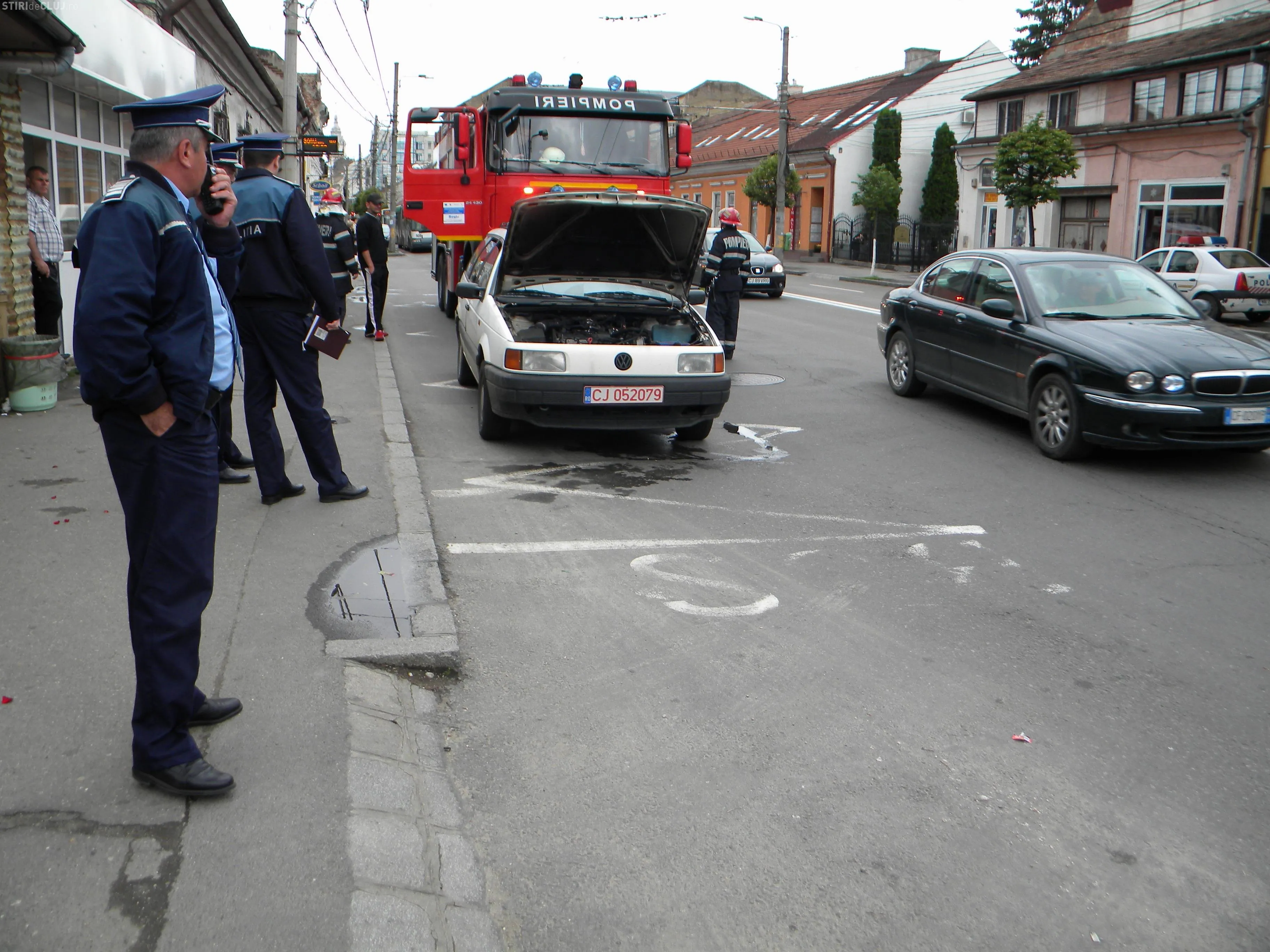 Pompierii și Poliția au intervenit pe strada Moților, în fața spitalului de Copii, unde o mașină a lat foc.
