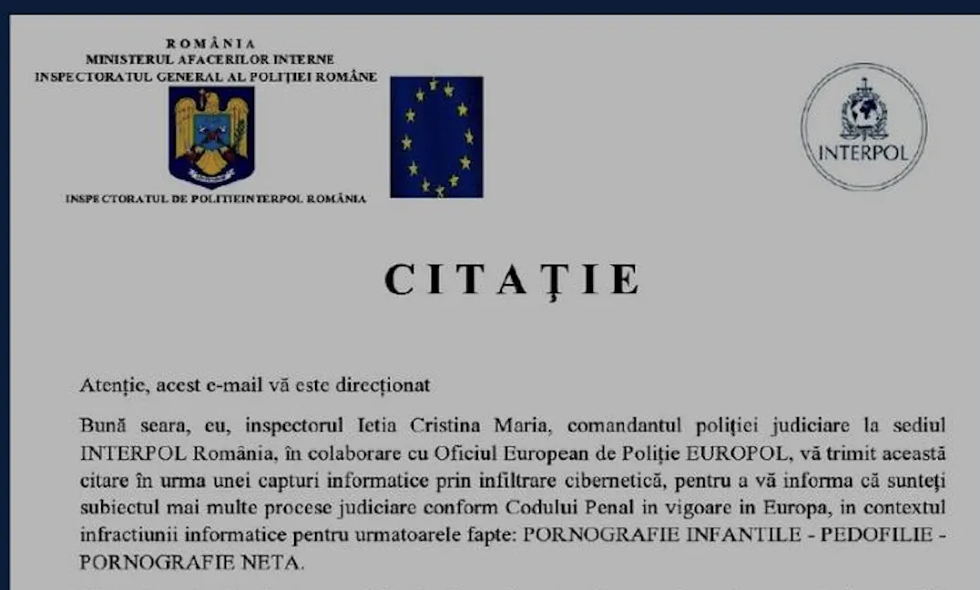 Directoratul Național de Securitate Cibernetică avertizează ca mai mulți hackeri trimit mail-uri cu citații false românilor pe mail. Aceștia trimit documente false care imită citații oficiale, aparent emise de instituții precum Poliția Română, Interpol sau Europol, cu scopul de a înșela destinatarii și de a obține date personale sau financiare.
