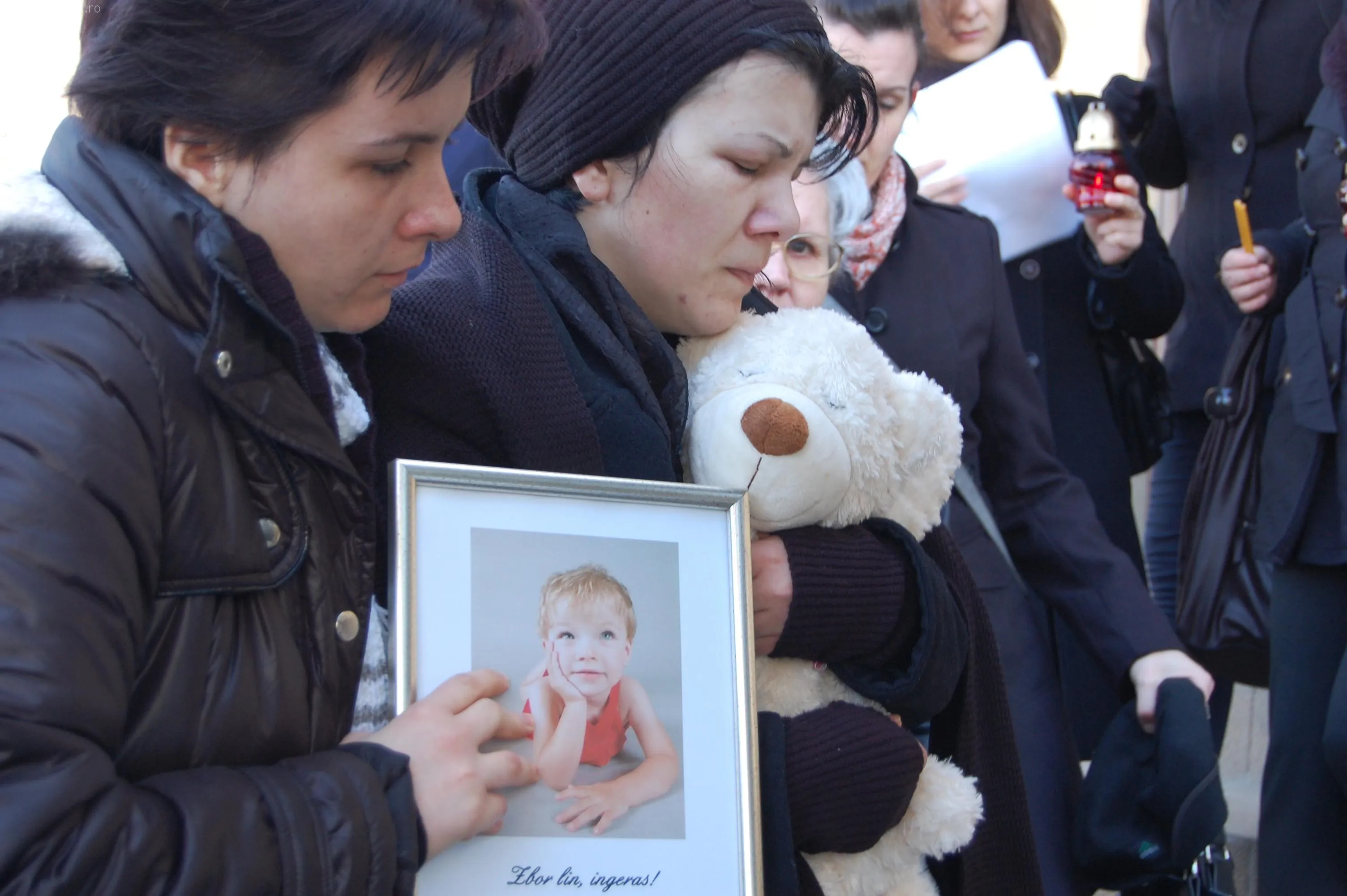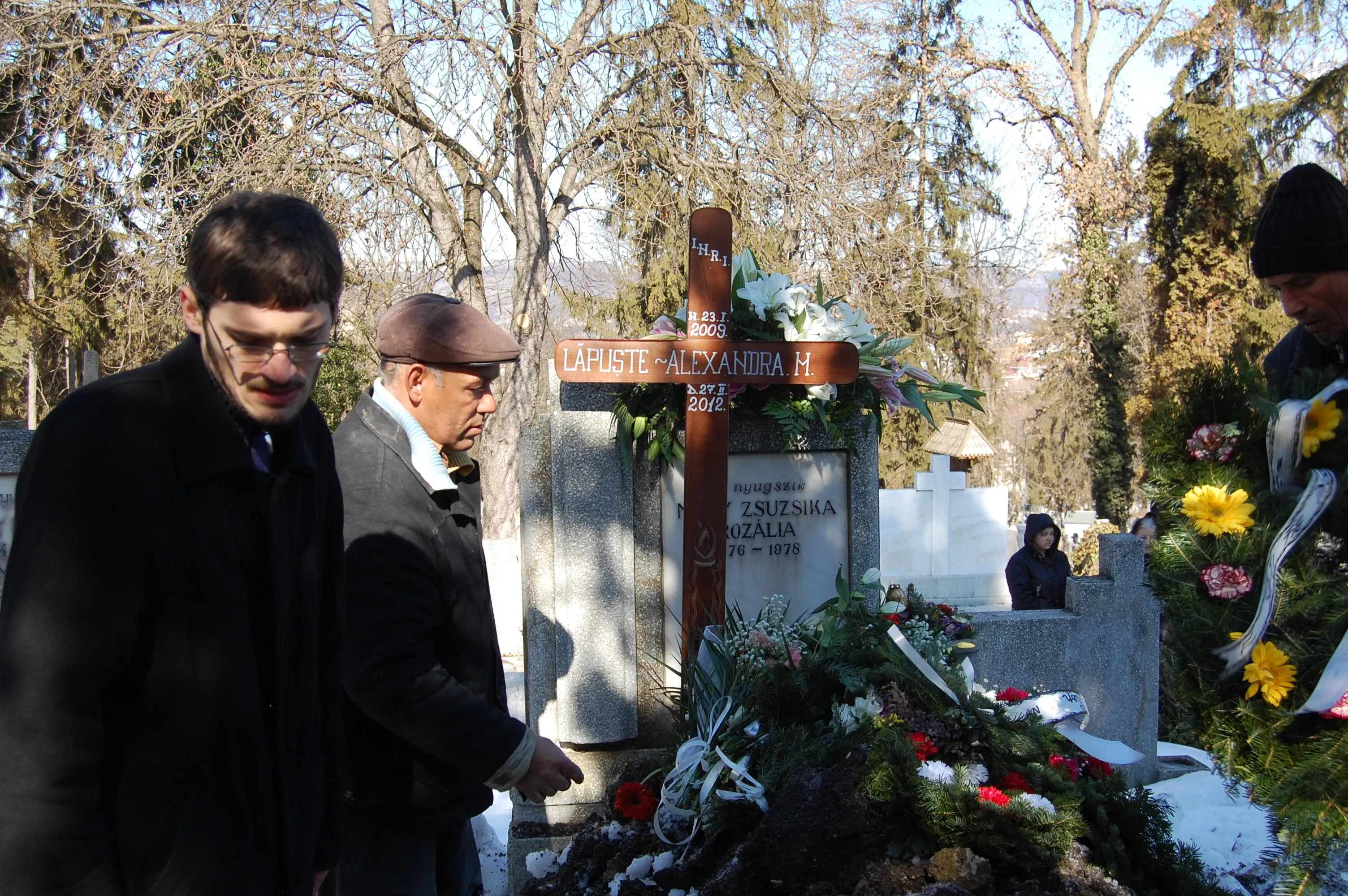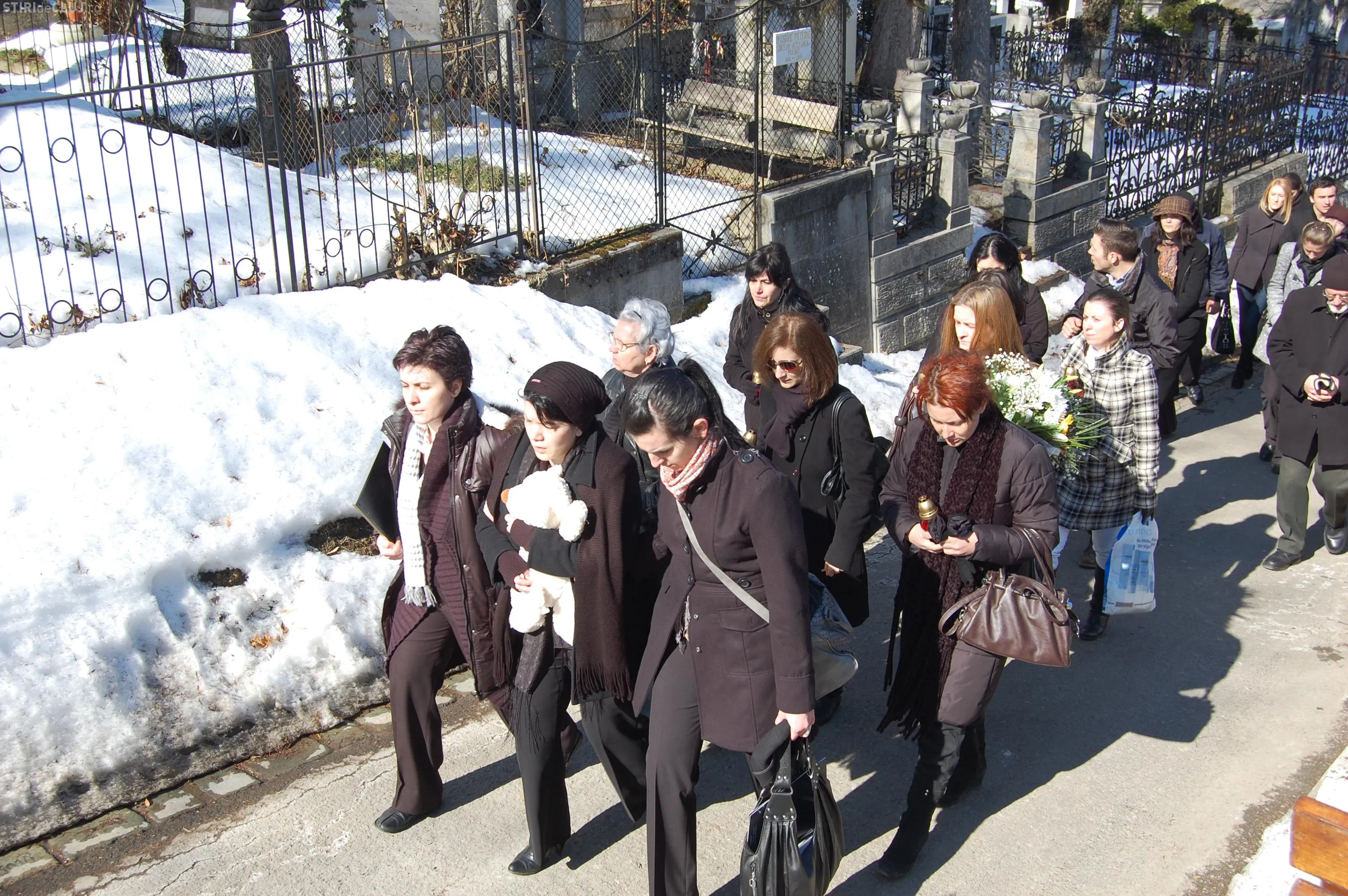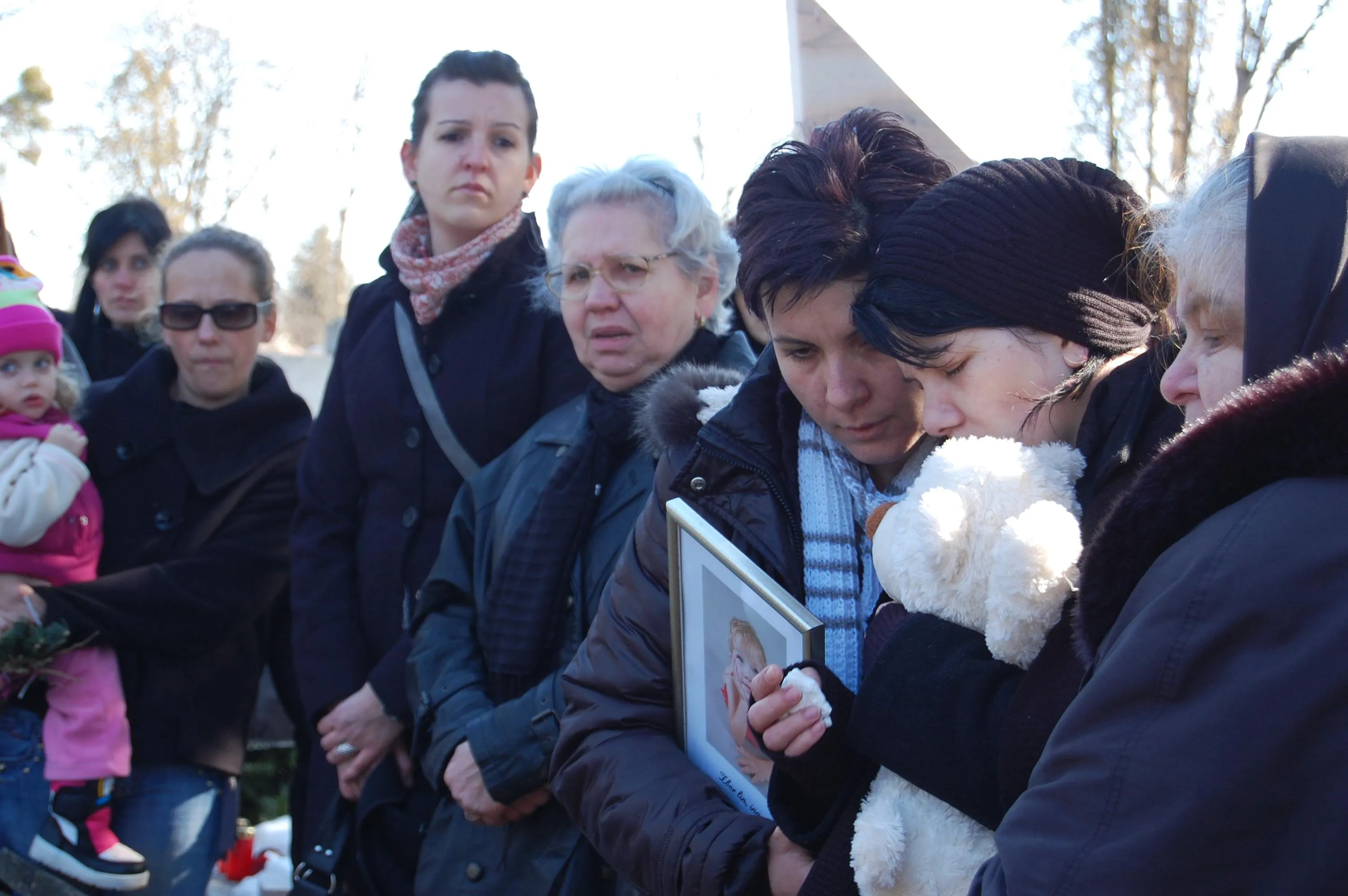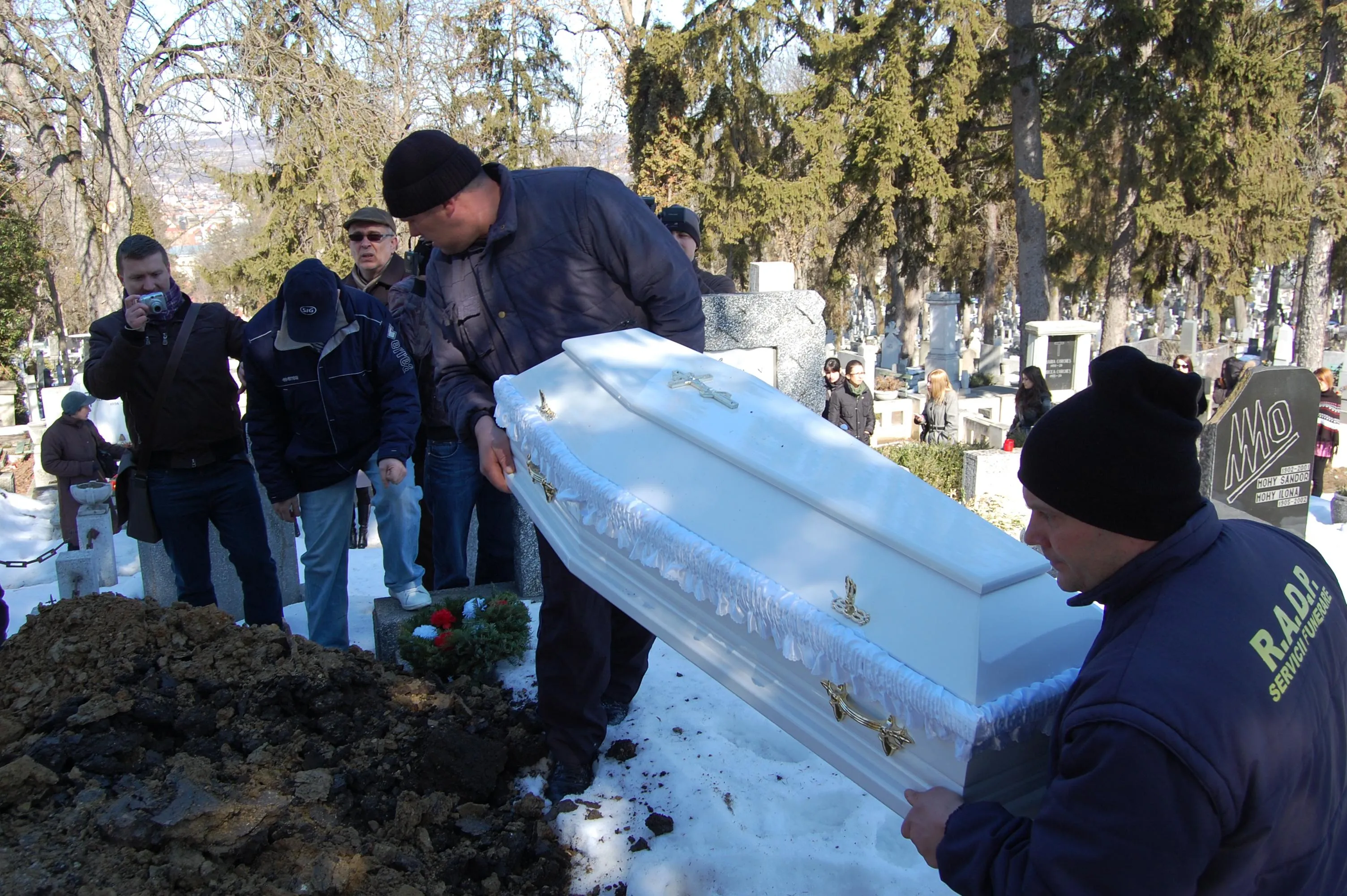 Slujba de inmormantare a inceput la ora 11.00. Langa sicriul alb a stat mama indurerata, Klaudia Nagy, familia, dar si fostii colegi de liceu si de facultate ai femeii. Mama micutei a strans in brate un ursulet de plus al Alexandrei, iar una dintre rude a adus o fotografie.
