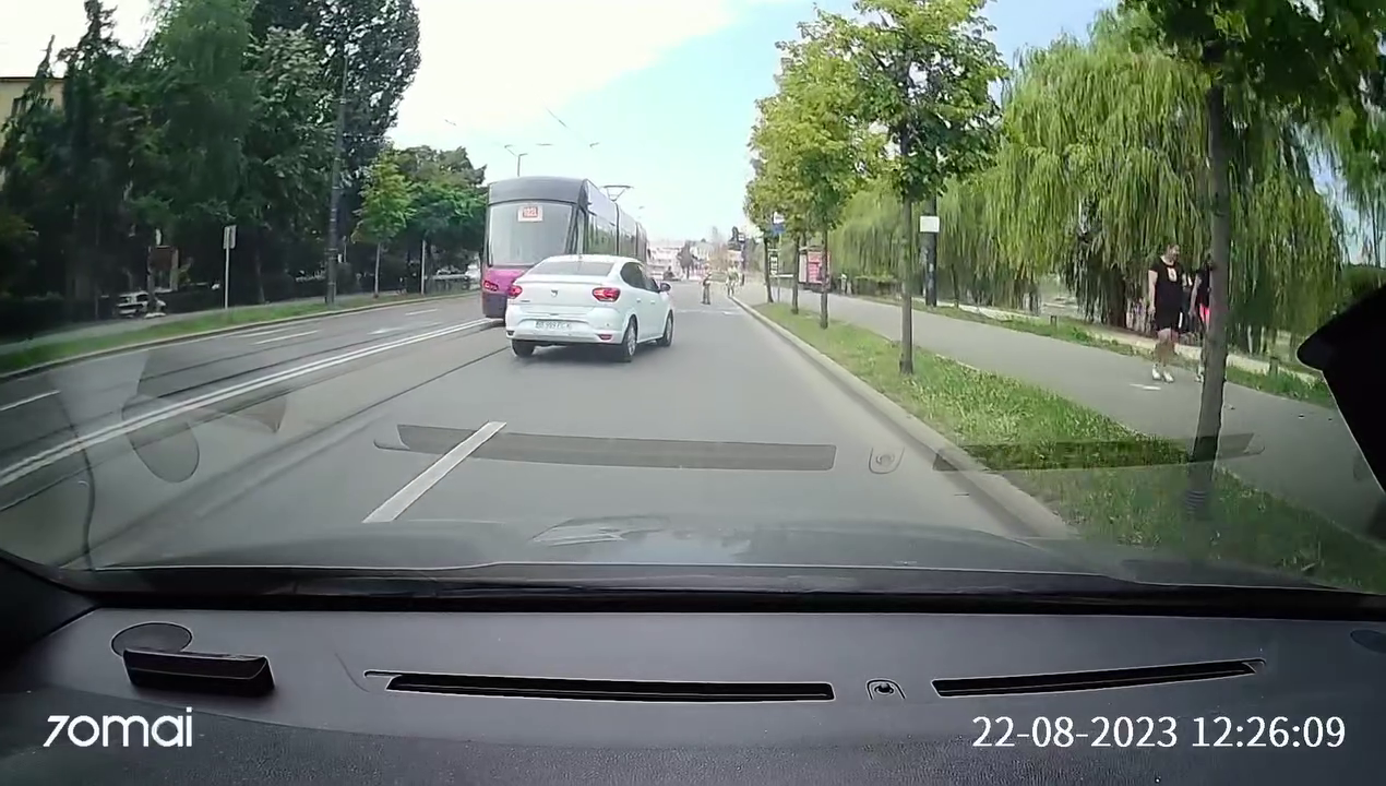 Practic, șoferul a schimbat banda de mers în ultima clipă, a intrat pe banda 1, cu toate că tramvaiul era oprit în stație, iar călătorii urcau și coborau. Acest lucru nu l-a împiedicat pe șofer să meargă mai departe, uitând de Codul Rutier, care îi cere să oprească atunci când tramvaiul este oprit în stație.