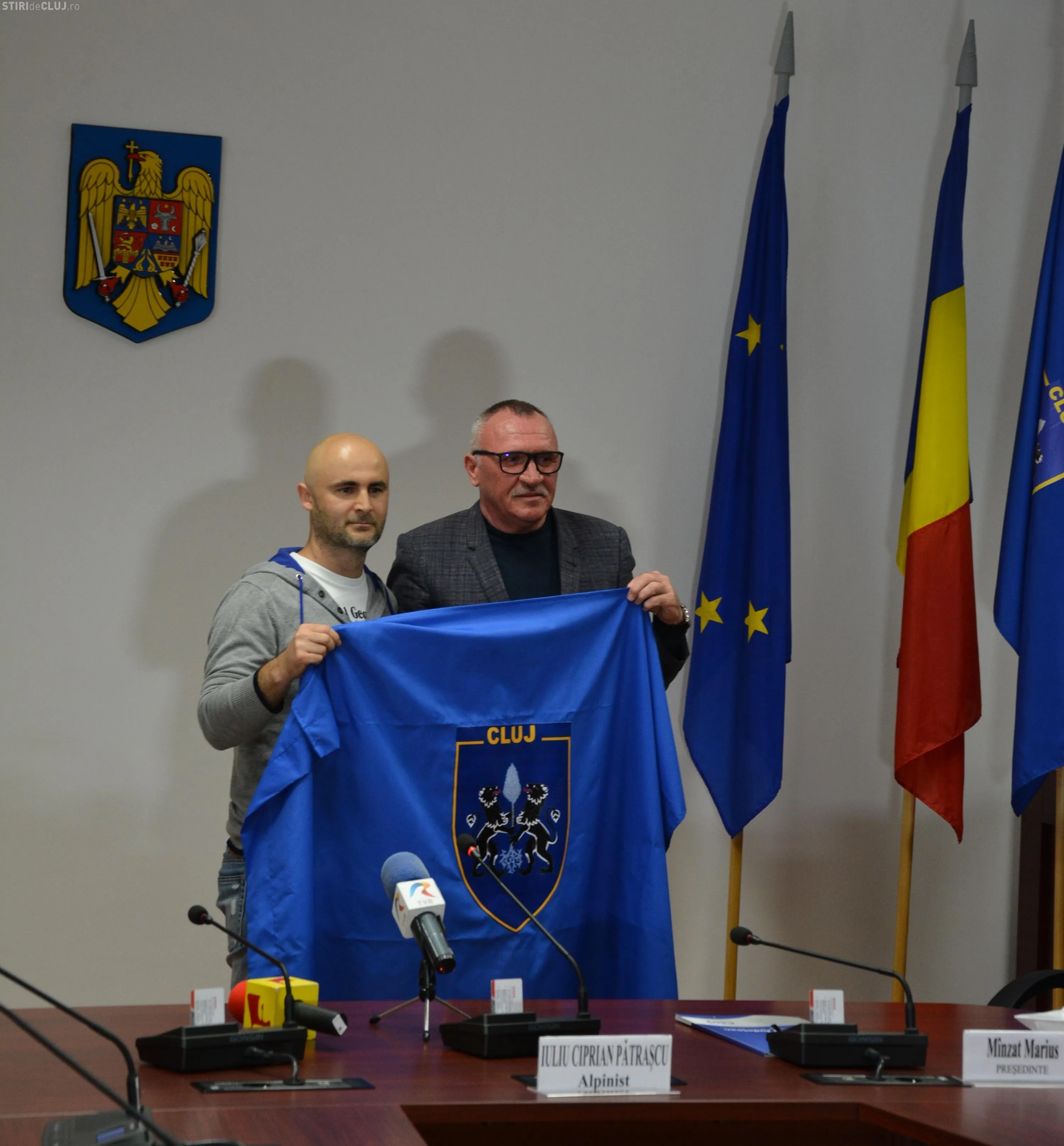 Preşedintele Consiliului Judeţean Cluj, Marius Mînzat, i-a înmânat drapelul cu însemnele judeţului Cluj cunoscutului alpinist Pătraşcu Iuliu Ciprian, cel care va încerca să cucerească cel mai înalt vârf din lume, Everest.
