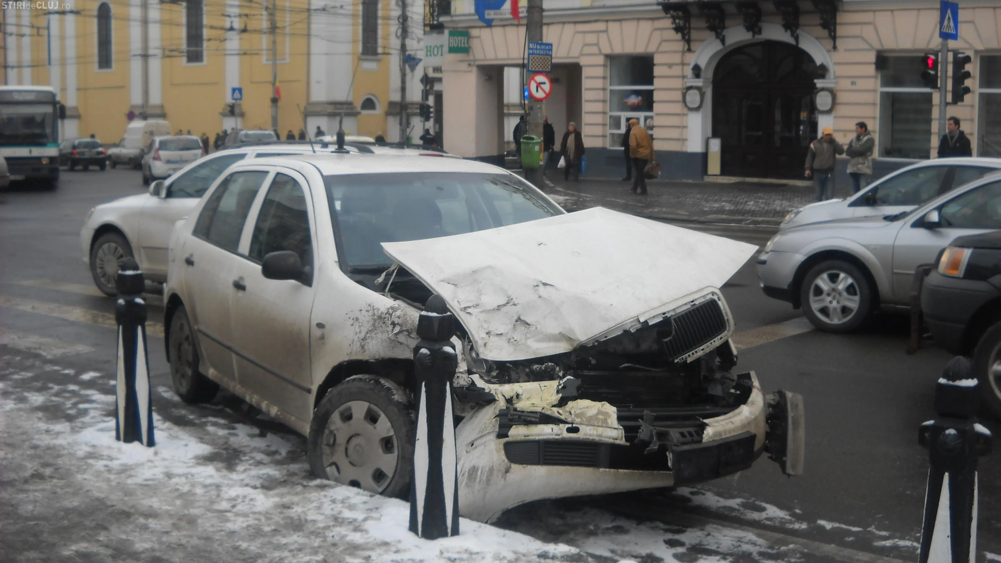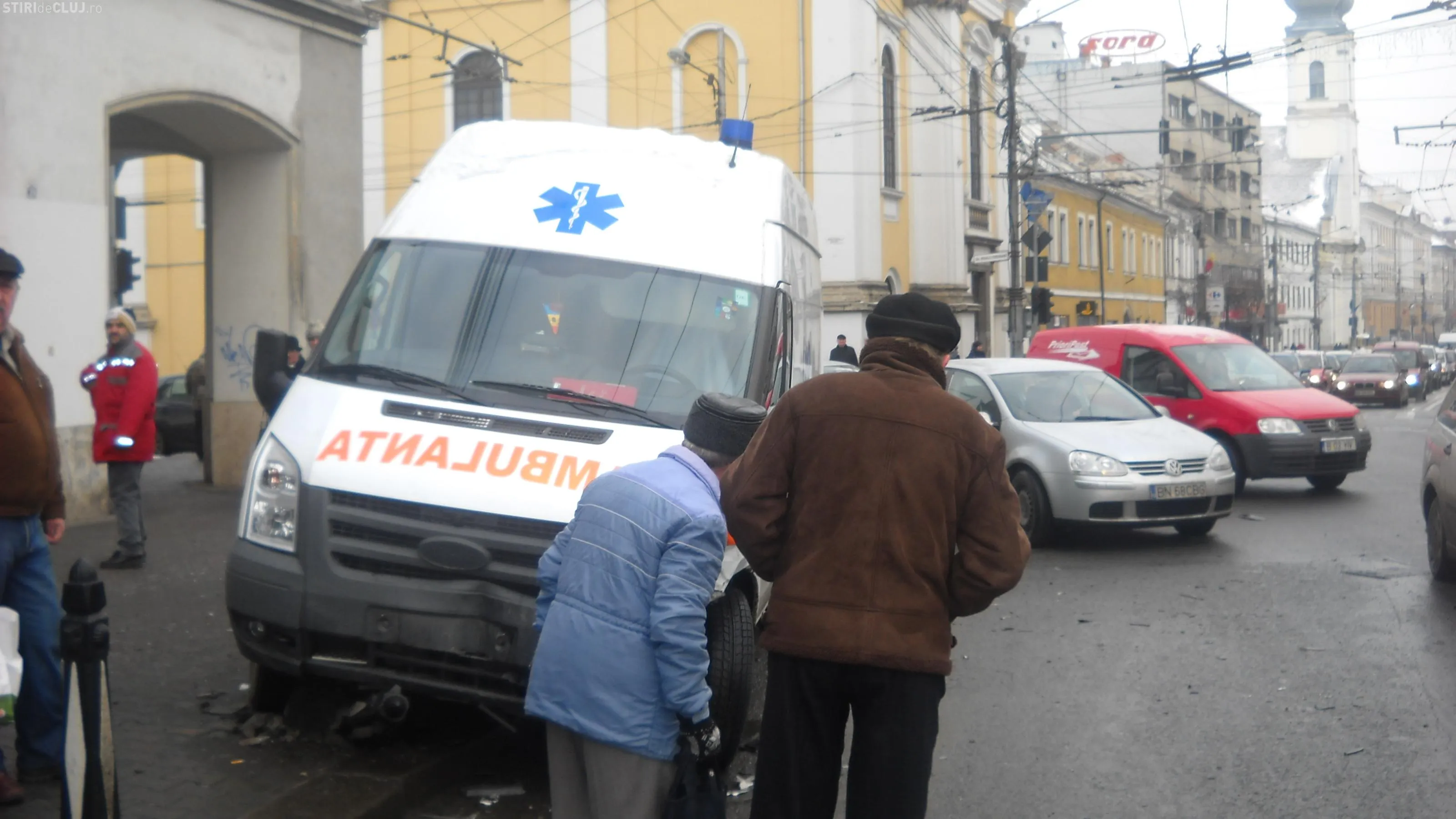 Un autoturism Skoda a pornit de la stopul din fata hotelului Melody si a intrat in plin intr-o ambulanta care venea de pe Bulevardul 21 Decembrie 1989.