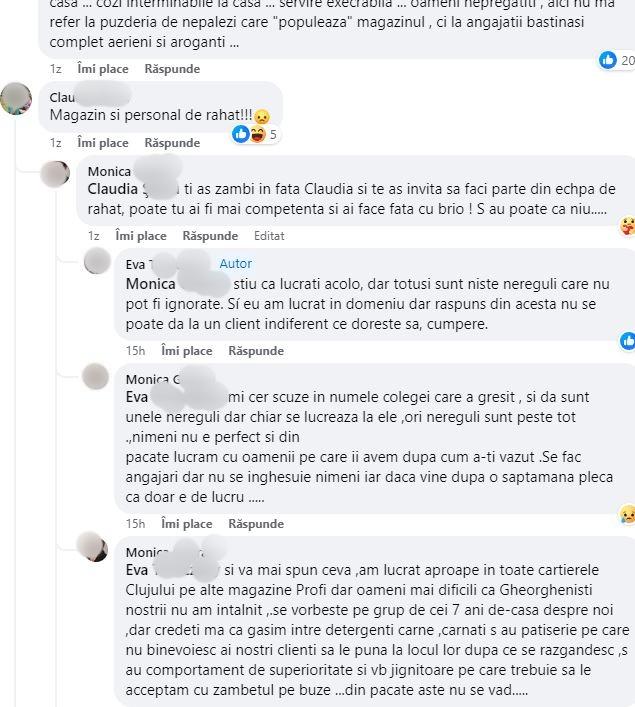 Alți ”gheorgheniști” au spus că magazinul și personalul sunt de ”r..at”. Acest lucru a determinat-o pe Monica, colegă cu doamna de la casa de marcat să intervină și să spună unele lucruri care au agitat mai tare spiritele.