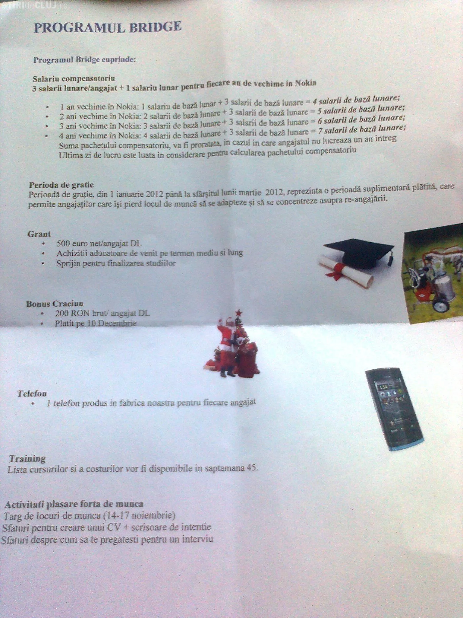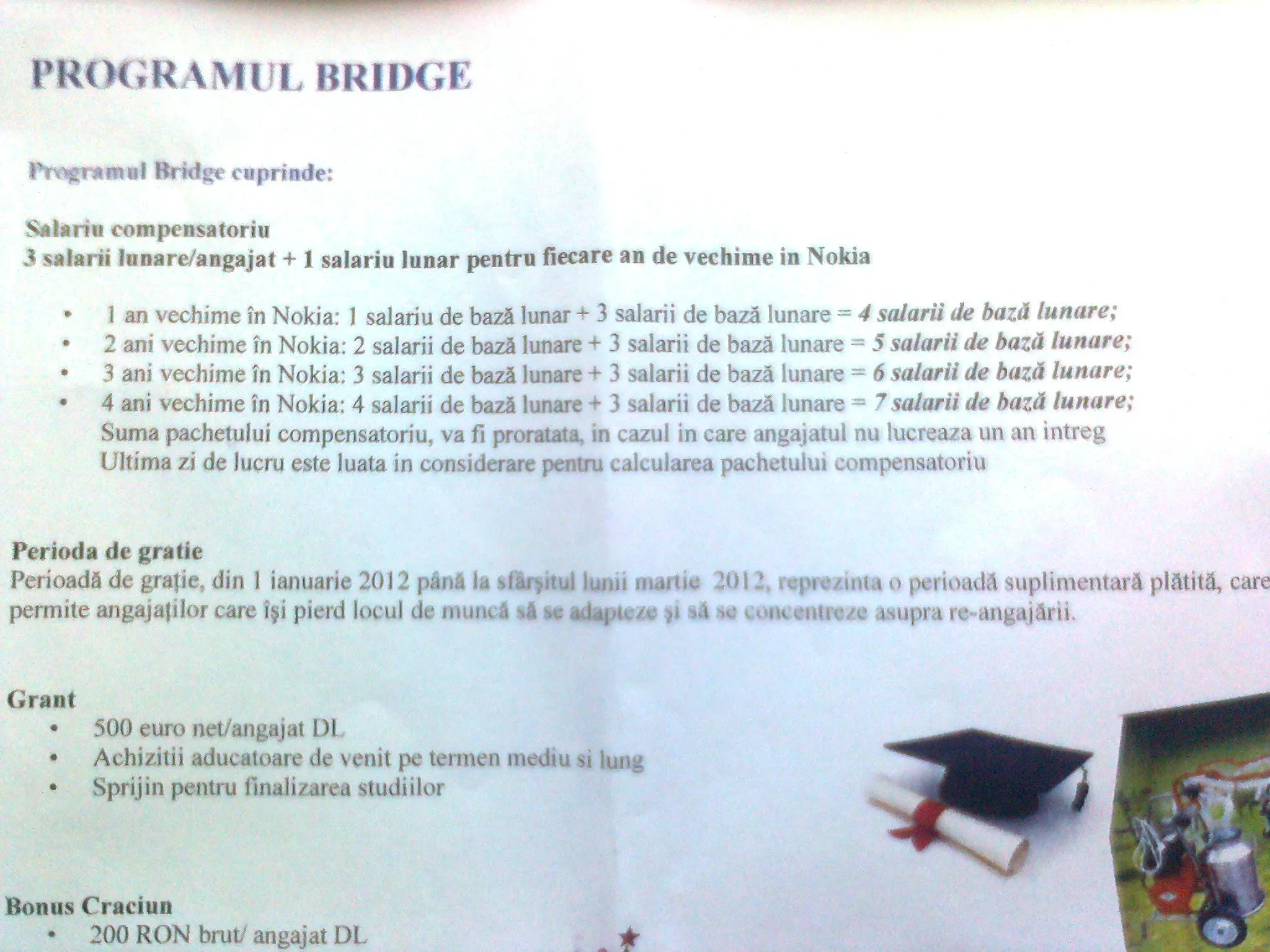 Angajatii Nokia de la Jucu au primit in urma sedintelor care au avut loc in ultimele zile un document intitulat programul Bridge, care mentioneaza ce beneficii vor avea la disponibilizare.