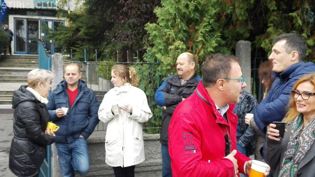 O parte din angajații Radio Cluj au făcut o pauză de cafea şi socializare, luni dimineața, în faţa studioului de pe strada Donath.