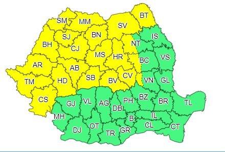 Potrivit meteorologilor, de astăzi, începând cu ora 17:00, până mâine, la ora 10:00, local în Banat, Crișana, Maramureș, Transilvania, nordul Moldovei, precum și la munte vor fi perioade cu instabilitate atmosferică accentuată ce se va manifesta prin intensificări ale vântului (rafale de 55...70 km/h și izolat peste 80 km/h), vijelii, frecvente descărcări electrice, grindină și averse torențiale (în intervale foarte scurte de timp cantitățile de apă vor fi de 20...25 l/mp și izolat peste 30...40 l/mp).