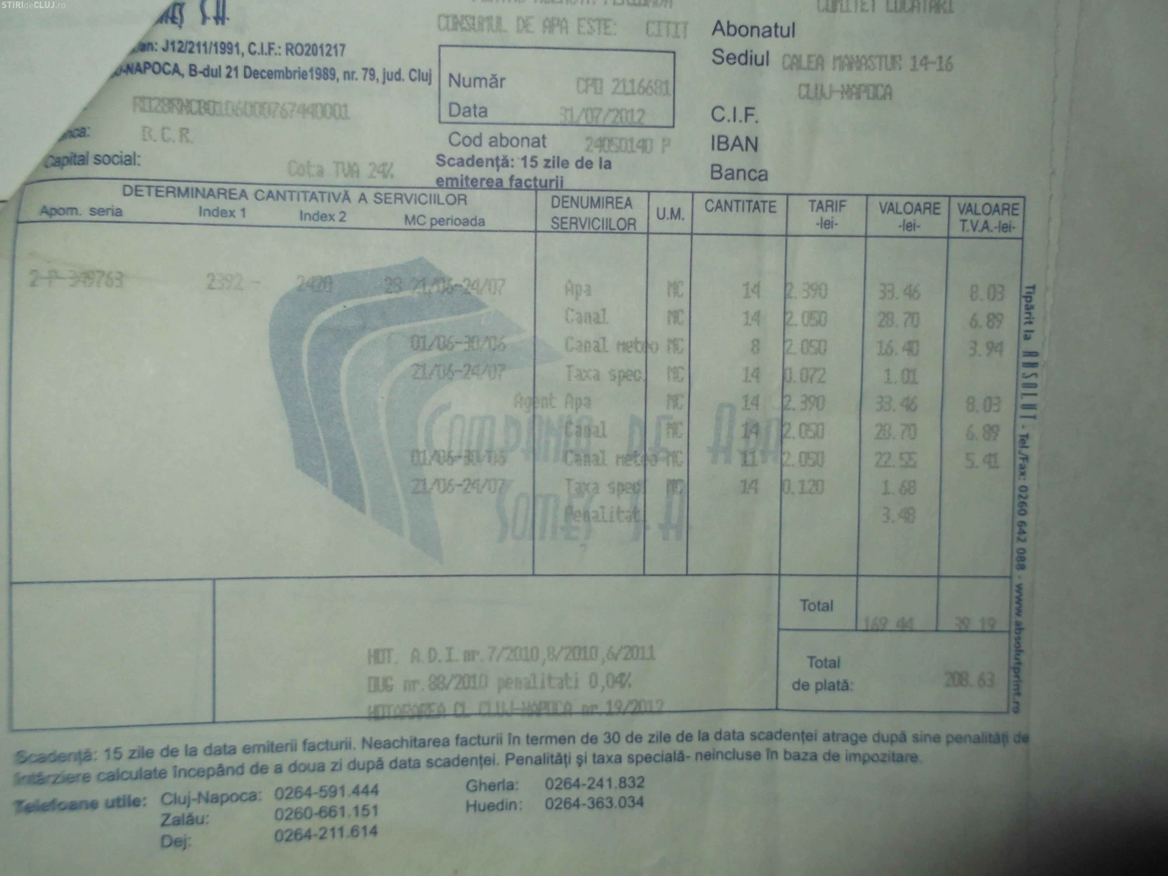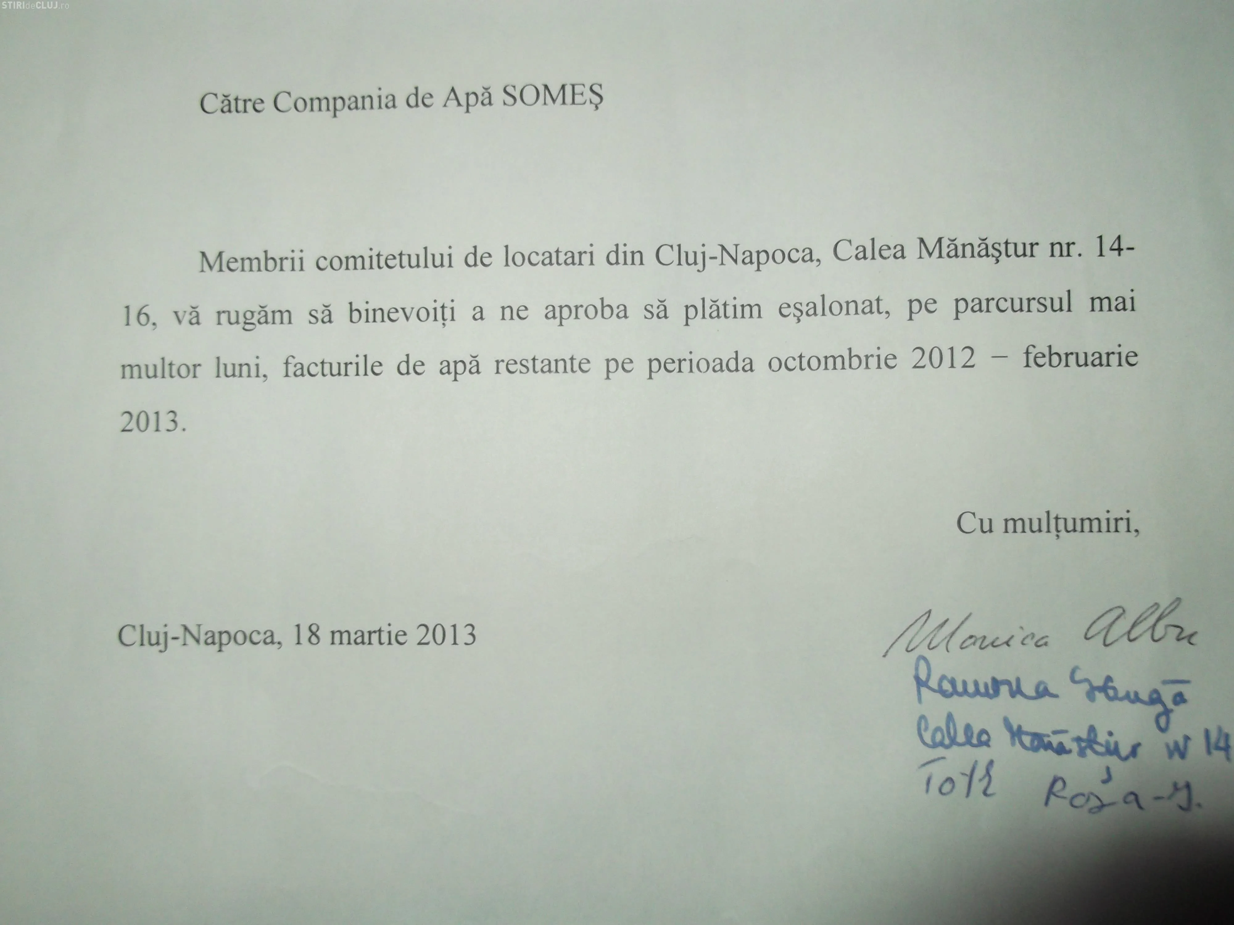 ”Imobilele de pe Calea Mănăștur nr. 14 - 16 plătesc apa la comun, conform apometrului aflat pe Calea Mănăștur nr. 12. Pe baza înțelegerii între cele trei familii care locuiesc în aceste imobile și domnul Adi Alexandru, fiecare familie și Primăria Cluj-Napoca, plătește apa consumată, indicată de aprometrul propriu, iar pierderile se împart în mod egal, la patru. De cinci luni, domnul Adi Alexandru refuză să mai plătească apa. Suma pe care o datorează este de 1.079,05 RON. Menționez că, din cauza unei țevi sparte, în ultimele luni pierderile de apă au fost mari și, în consecință, și valorile facturilor au fost mai mari decât cele obișnuite.