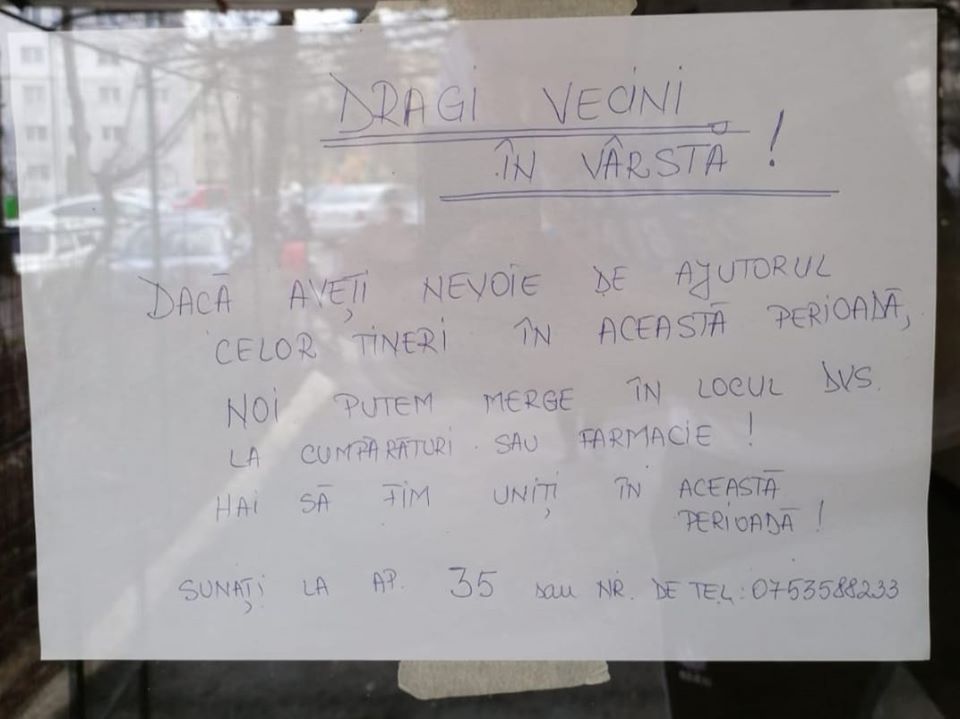 O studentă de la UBB Cluj s-a gândit să îi ajute pe cei vârstnici în această perioadă și a pus un anunț la intrare în scara blocului, prin care îi anunță pe ”bunicii” din bloc că pot suna la ea la ușă, dacă au nevoie de ajutor.