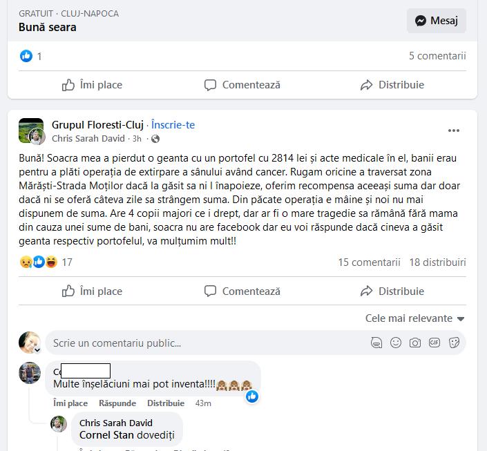 “Soacra mea a pierdut o geanta cu un portofel, cu 2814 lei, și acte medicale în el. Banii erau pentru a plăti operația de extirpare a sânului, având cancer. Rugăm pe oricine a traversat zona Mărăști - strada Moților, dacă l-a găsit să ni-l înapoieze. Oferim recompensă aceeași sumă, dar doar dacă ni se oferă câteva zile să strângem suma.