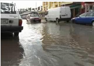 In jurul orei 19, 00 o ploaie torentiala pornita parca din senin a transformat cateva strazi din Dej in rauri. A durat doar 10 minute, dar a fost suficient pentru ca reteaua de canalizare din oras sa cedeze.