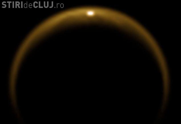NASA detine dovada ca exista apa pe cea mai mare luna a planetei Saturn. O fotografie ilustreaza o relfexie luminoasa de pe o suprafata lichida aflata pe luna Titan.